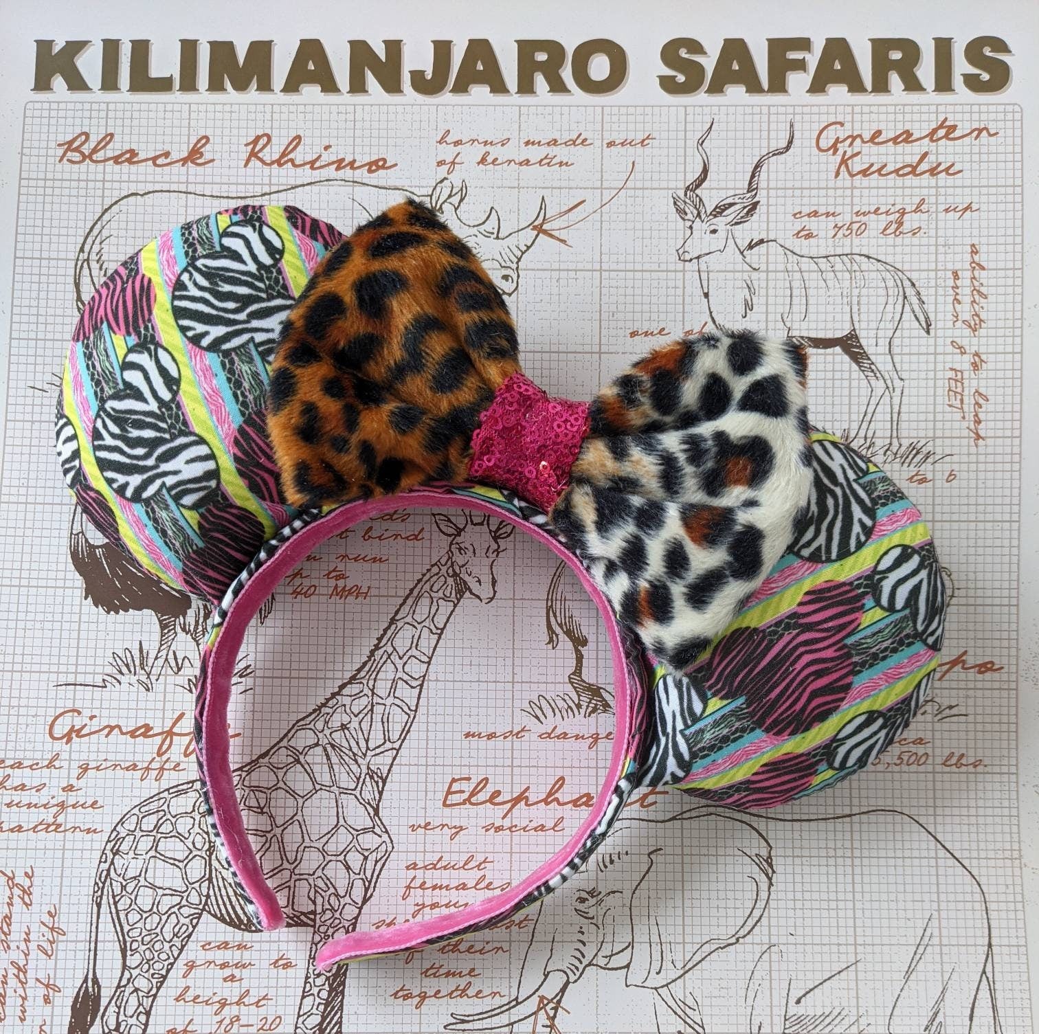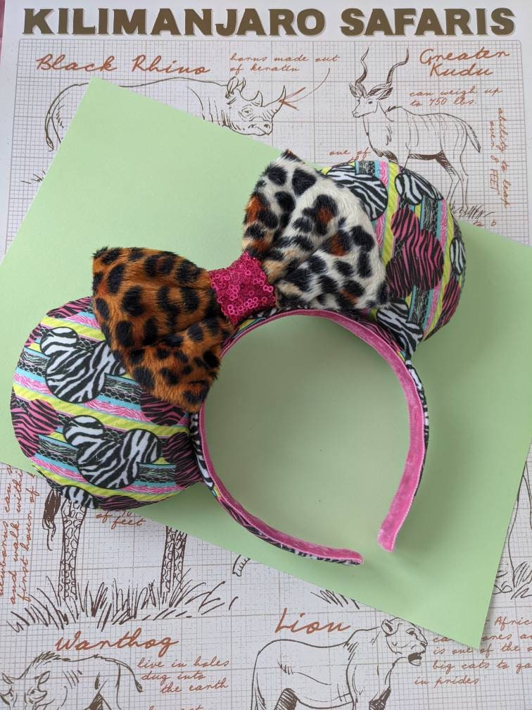 Super cute cheetah print furry mouse ears. Perfect for a ride on Kilimanjaro Safaris! Look cool at Animal Kingdom with these custom ears. These ears are custom made by me in Scotland with love, care and a little pixie dust. They are plush on both sides with a sturdy foam board interior. The headband is standard size, but flexible and should fit adults and children (but most likely not suitable for toddlers) Can be made without the bow for fellas. I love making custom orders! Please feel free to contact me if you'd like something a little different.