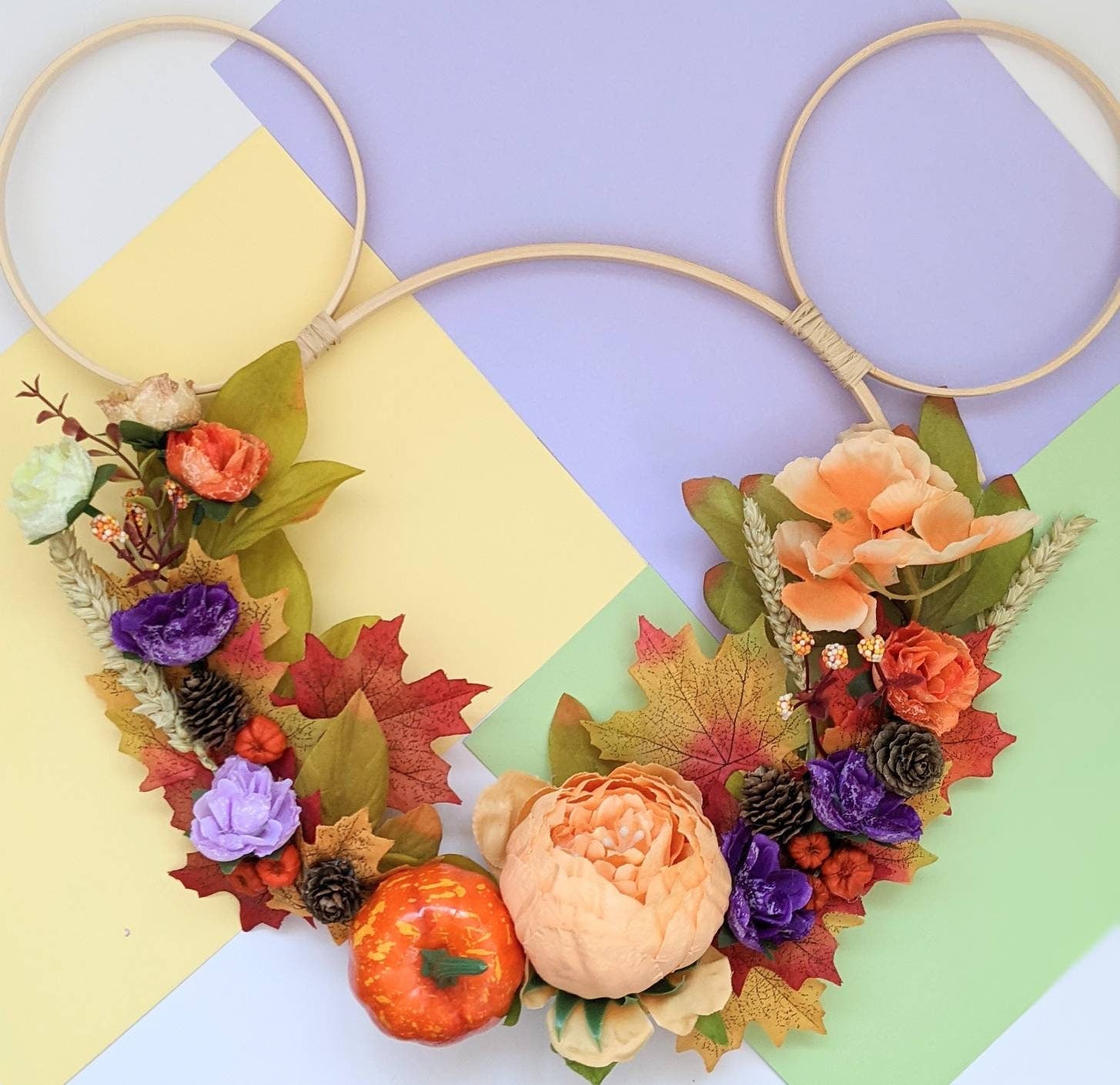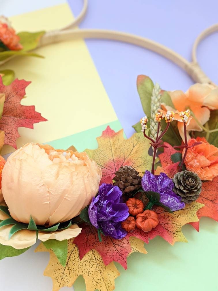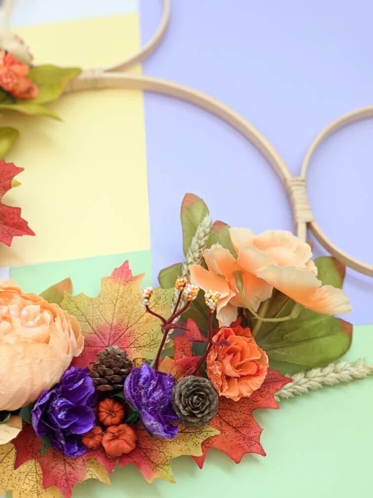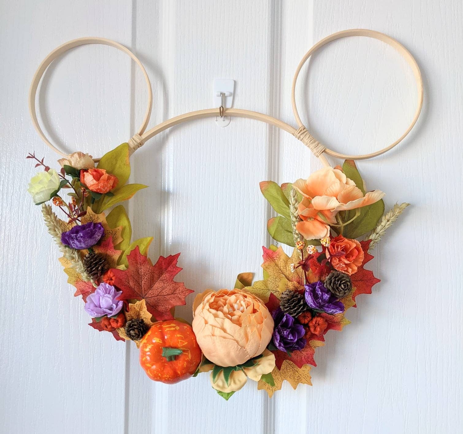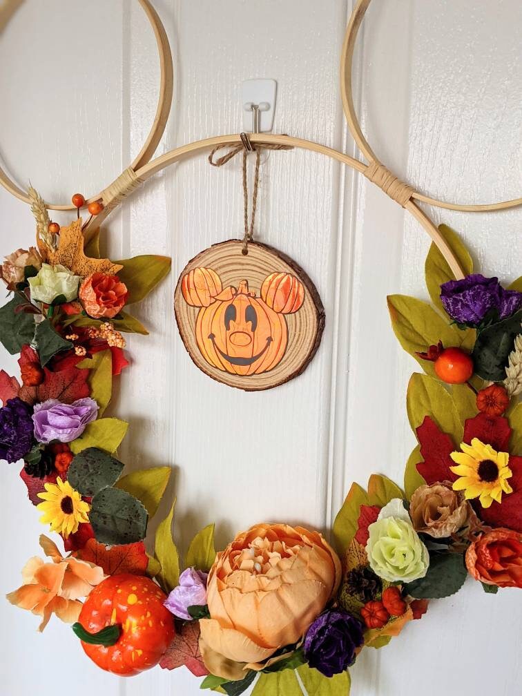 Mickey shaped hoop wreath/wall hanging inspired by my favourite season - Autumn! Made with beautiful artificial flowers (picture is for illustrative purposes and flower placement will be similar but not exactly the same). Various sizes available. Please message me if you'd like to discuss custom options.