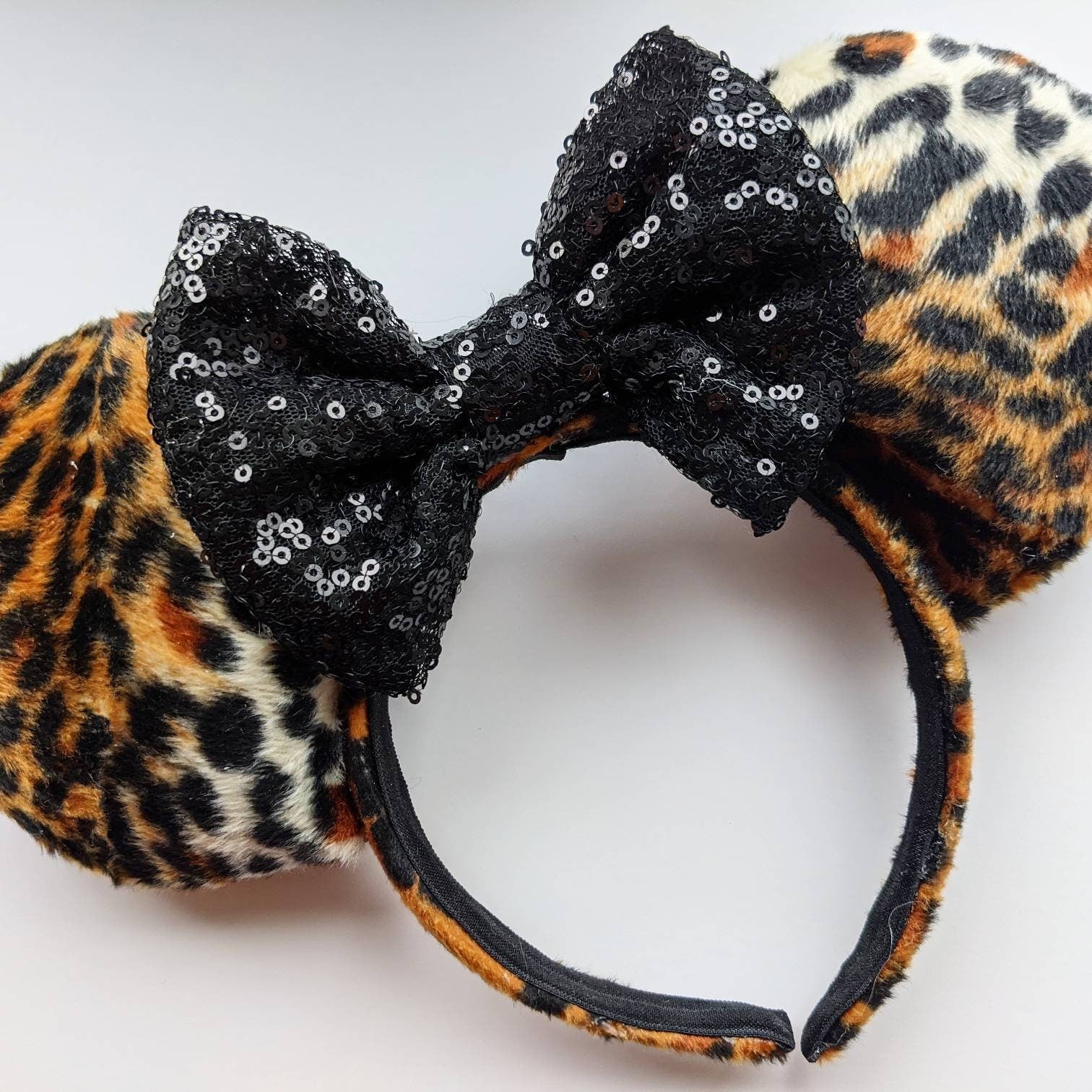 Super cute cheetah print furry mouse ears. Perfect for a ride on Kilimanjaro Safaris! Look cool at Animal Kingdom with these custom ears made with faux fur and a sparkly black sequin bow. These ears are custom made by me in Scotland with love, care and a little pixie dust. They are plush on both sides with a sturdy foam board interior. The headband is standard size, but flexible and should fit adults and children (but most likely not suitable for toddlers) Can be made without the bow for fellas. I love making custom orders! Please feel free to contact me if you'd like something a little different.