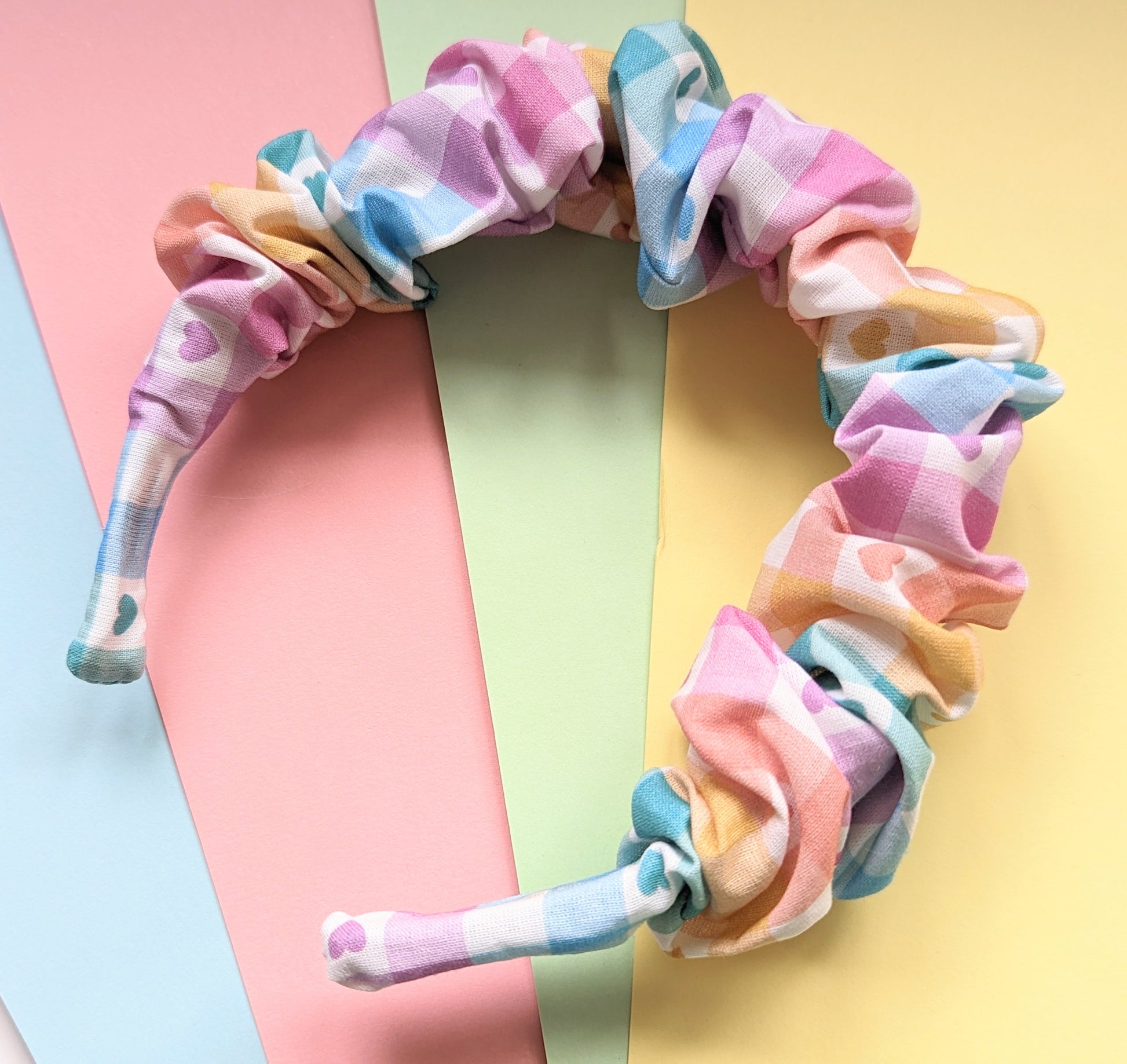 A very soft and flexible Alice band that is suitable for kids and adults made with pastel rainbow gingham fabric - Perfect for park days or just to brighten up your everyday outfits!