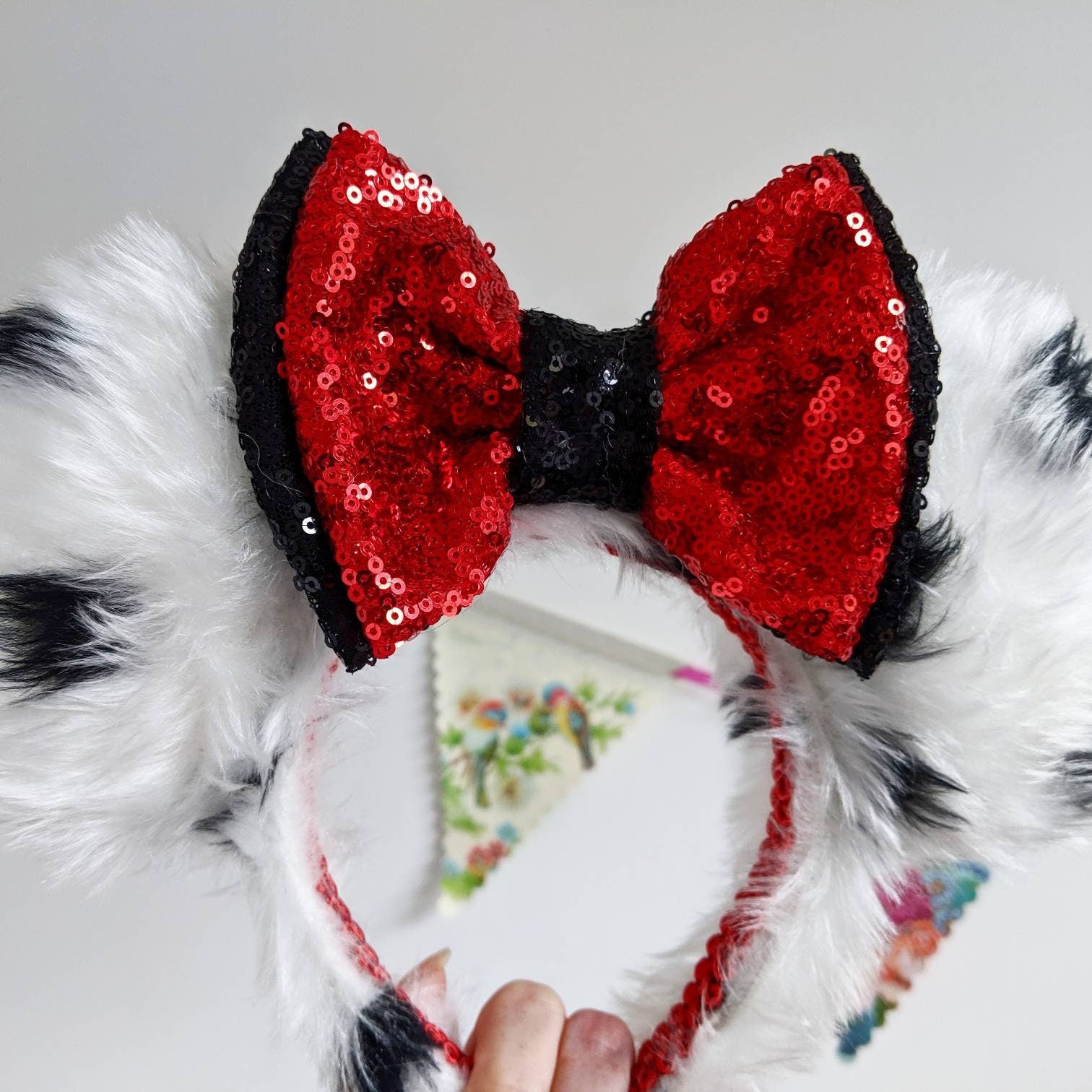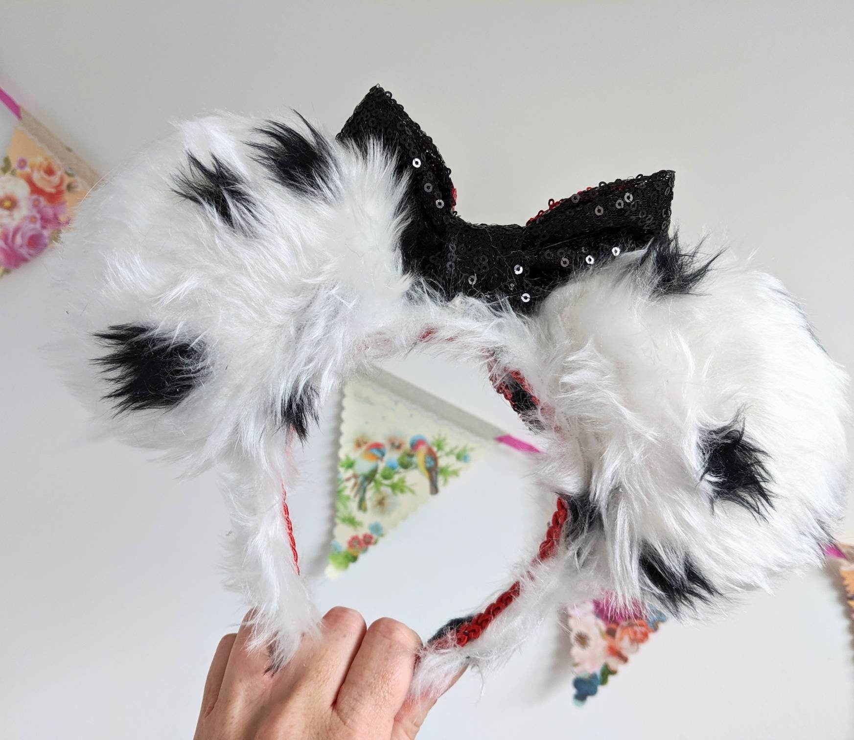 Gorgeous handmade villain inspired mouse ears!n Handmade in Scotland with love, care and a little pixie dust. These ears are made beautiful soft faux fur fabric with a black and red sequin double bow. The ears are plush and padded on both sides with a foam board interior to make them nice and sturdy. The headband is covered with matching fabric and is very comfortable. Headbands are a standard size, but flexible and should fit adults and children, but most likely not suitable for toddlers. All ears are custom made to order. I love making custom orders - please feel free to contact me if you have any special requests.