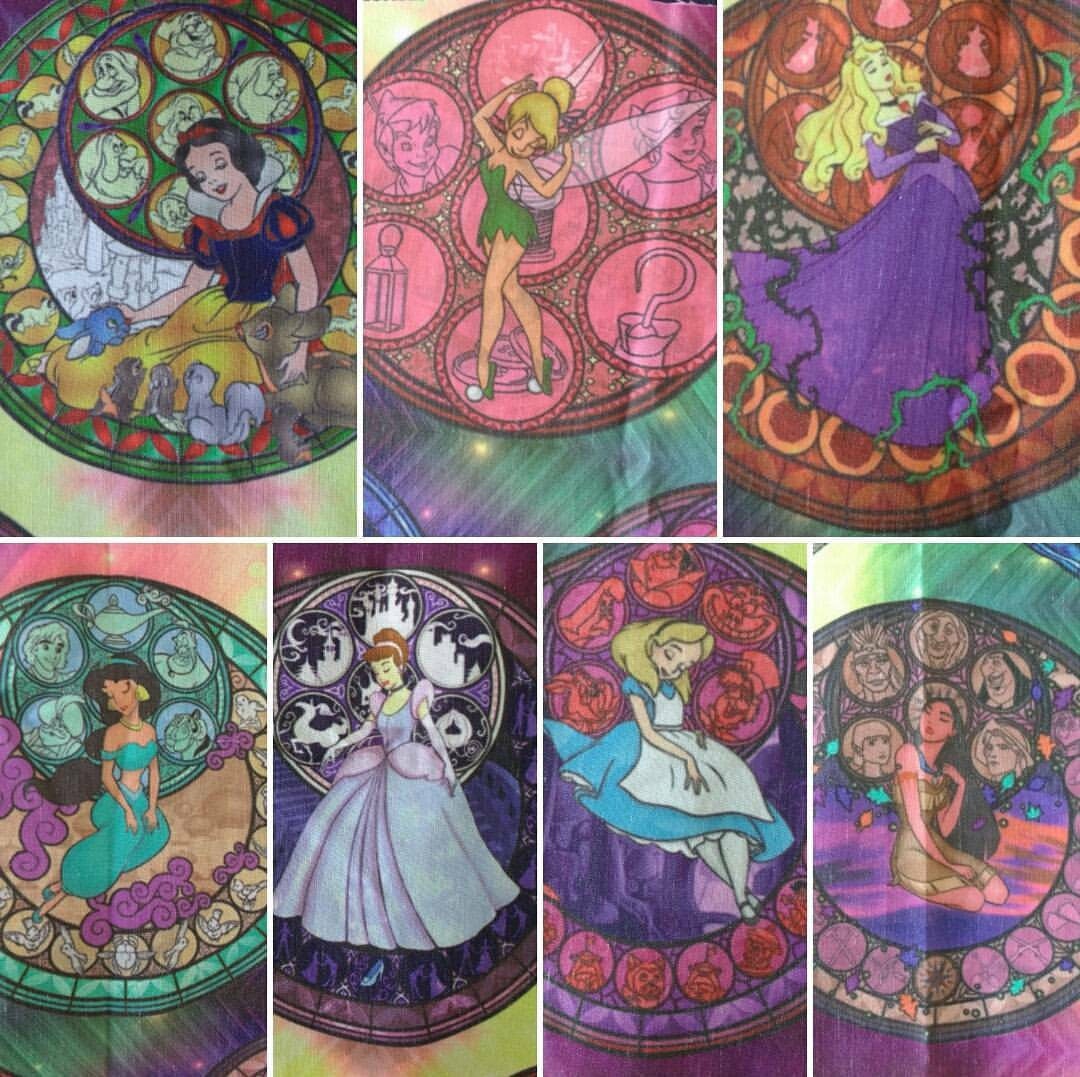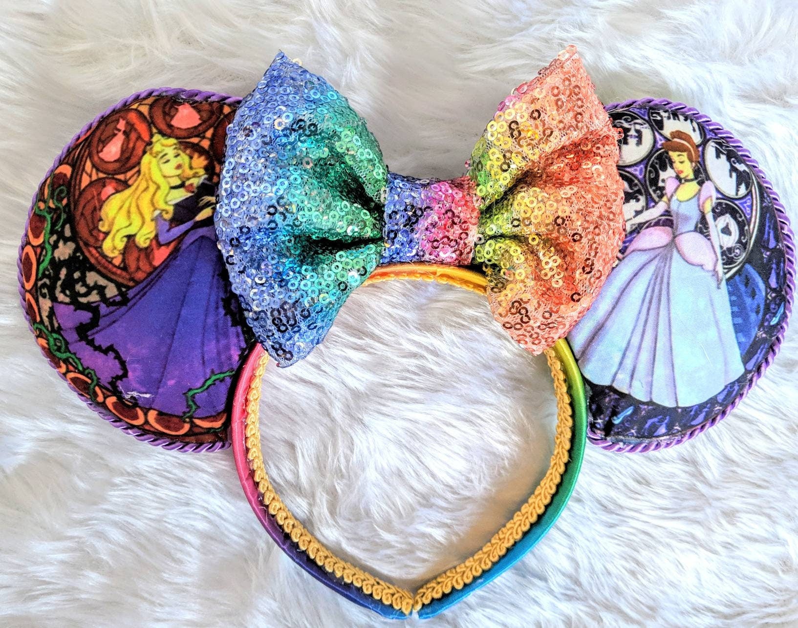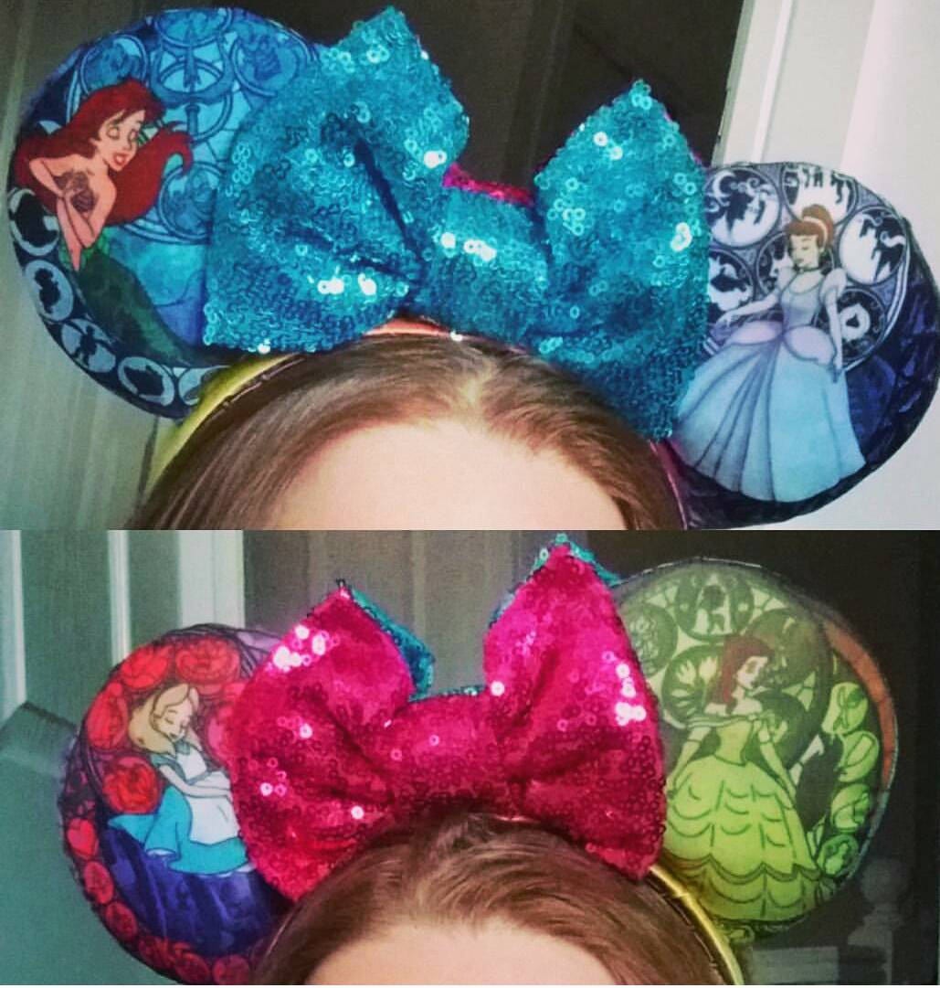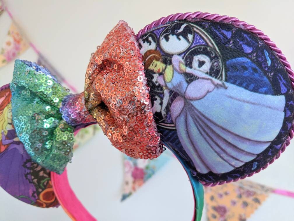 Gorgeous handmade mouse ears made with the cutest Stained Glass style fabric featuring all your favourite leading ladies! Leave a note with your order with which characters you would like. 2 princesses and rainbow satin on the back is £19, 4 princesses (2 on the front and 2 on the back and the option of 2 bows to make them reversible) is £21