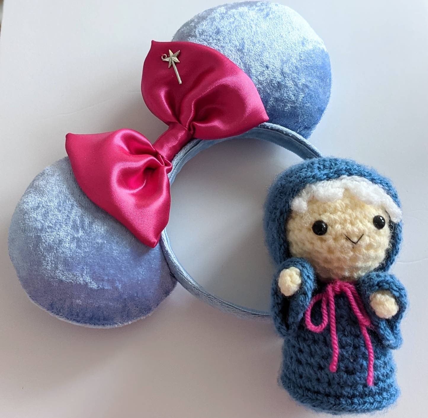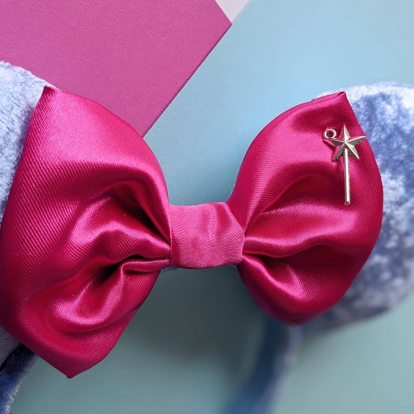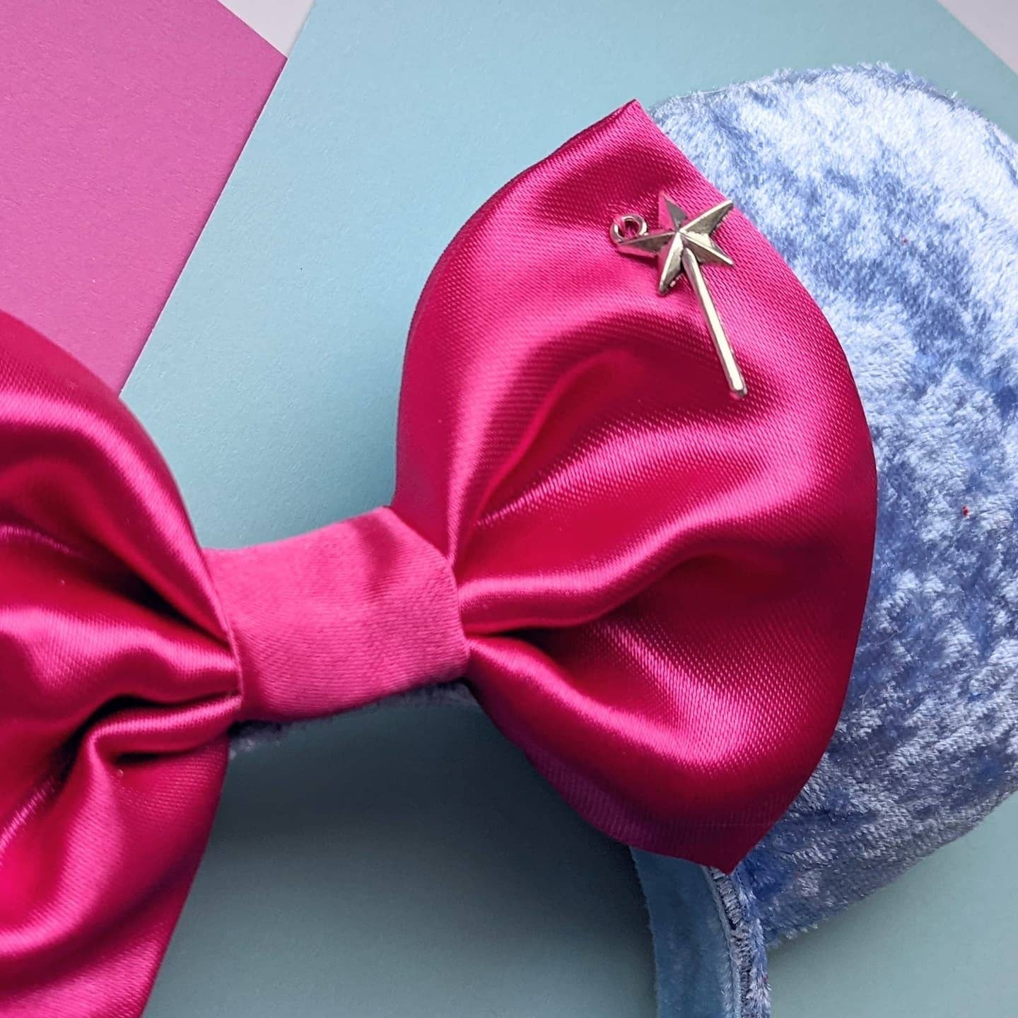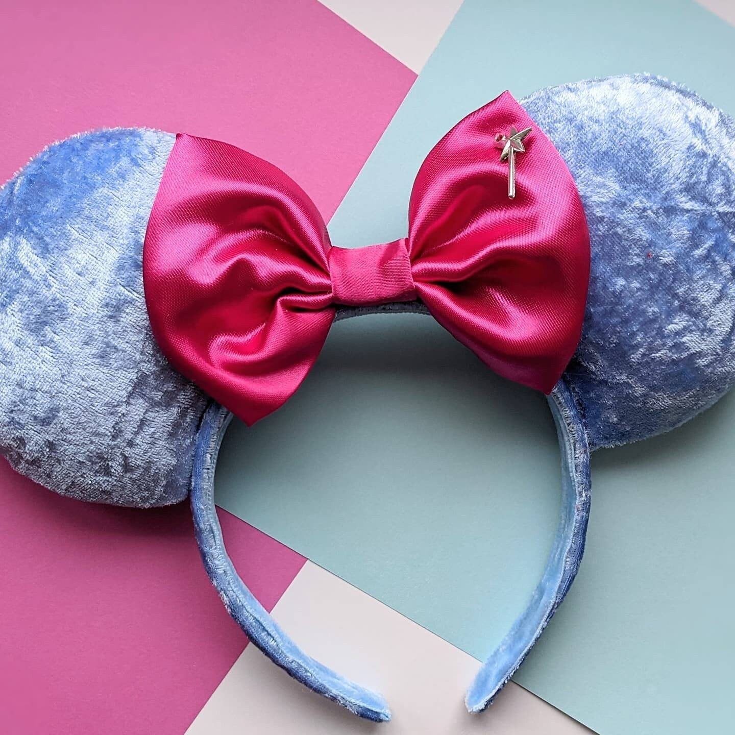 Bibbidi Bobbidi Boo! These ears are made with blue velvet fabric with a pink satin bow and wand embellishment. Just like The Fairy Godmother's costume in the Parks! Handmade in Scotland with love, care and a little pixie dust. These ears are padded on both sides with a sturdy foam board interior. The headband is standard size but flexible and should fit adults and children (but most likely not suitable for toddlers)