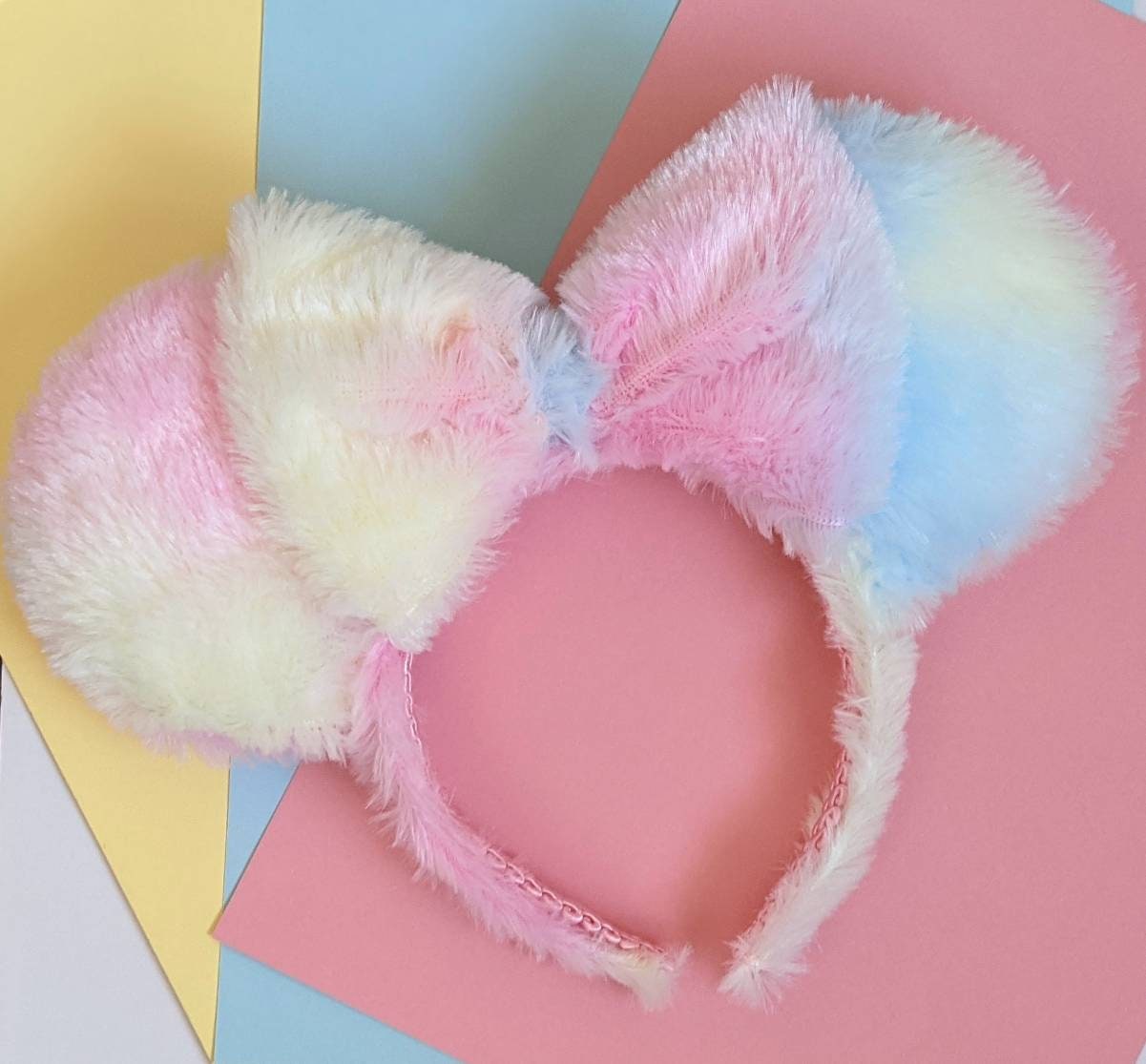 Gorgeous handmade mouse ears made fluffy pastel rainbow fabric Handmade in Scotland with love, care and a little pixie dust. The ears are plush and padded on both sides with a foam board interior to make them nice and sturdy. The headband is covered with matching fabric and is very comfortable. Headbands are a standard size but flexible and should fit adults and children, but most likely not suitable for toddlers.