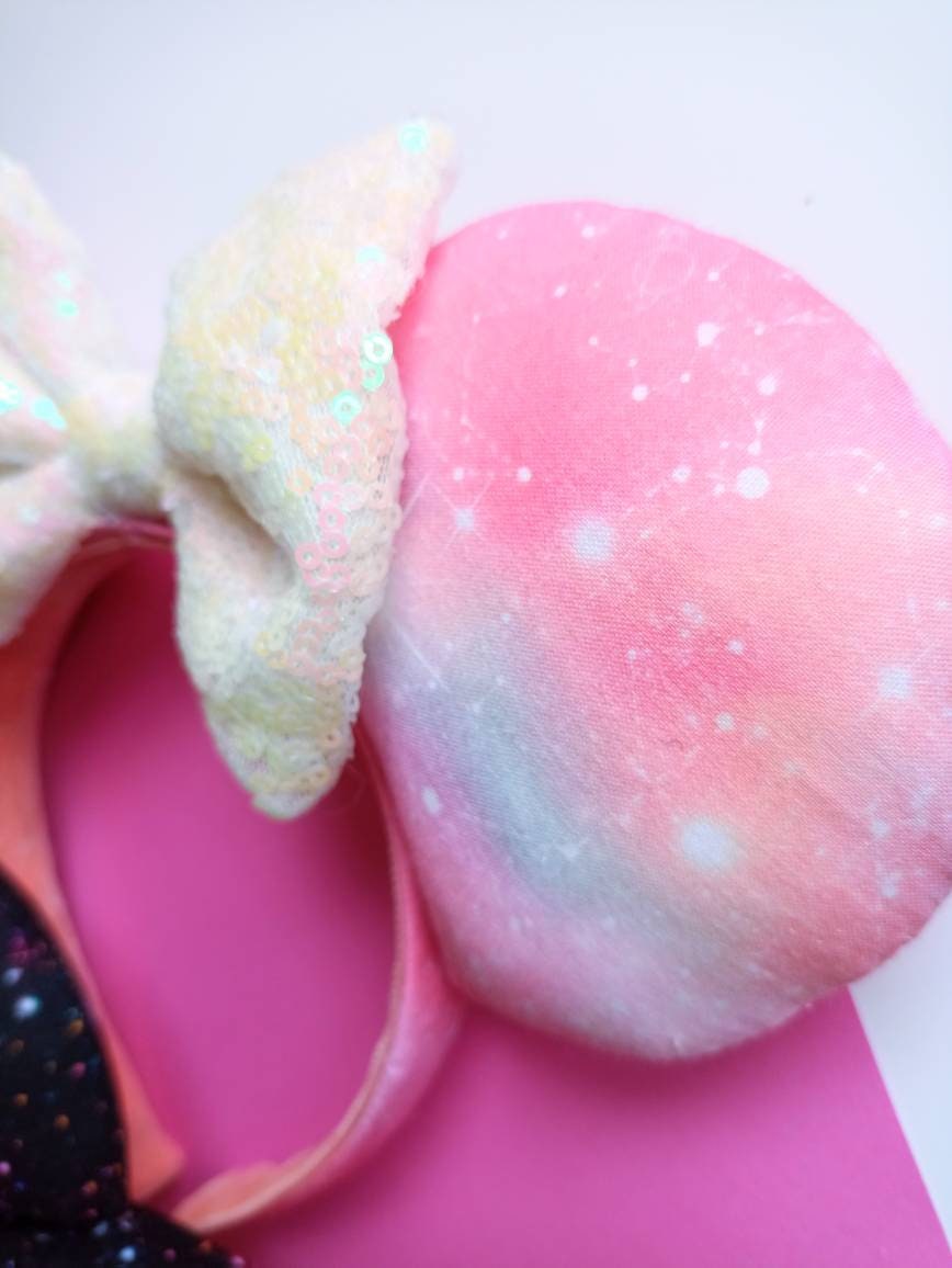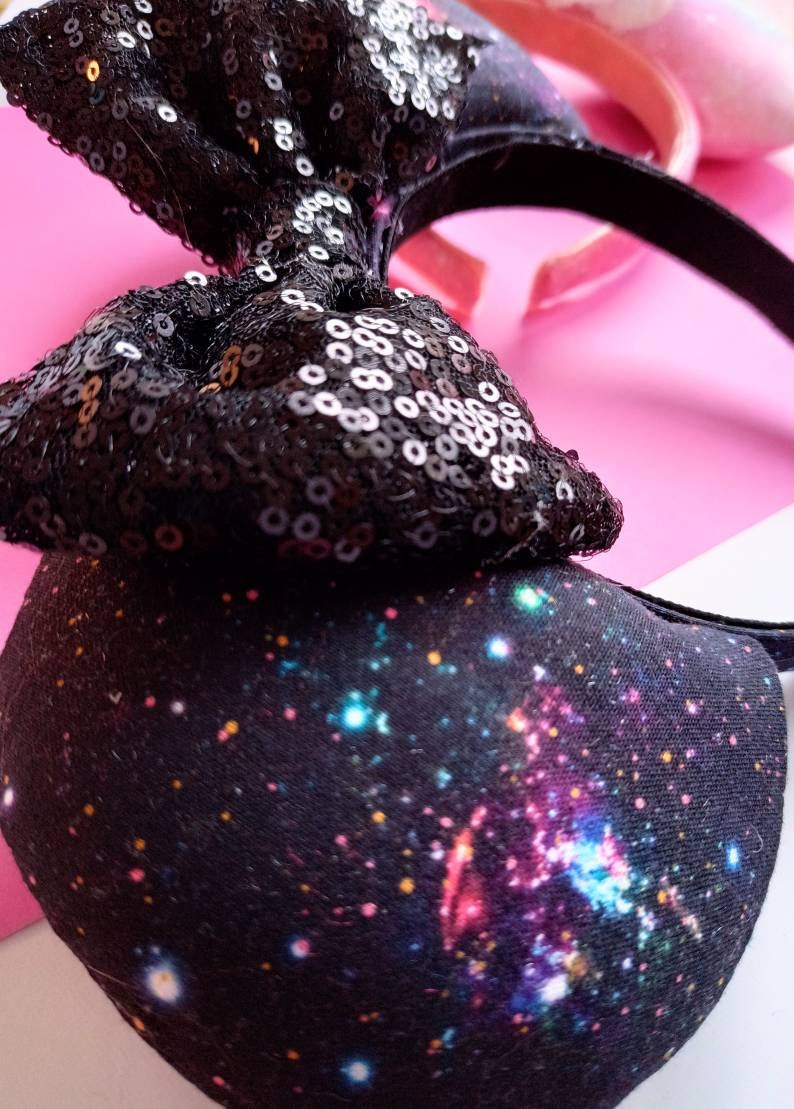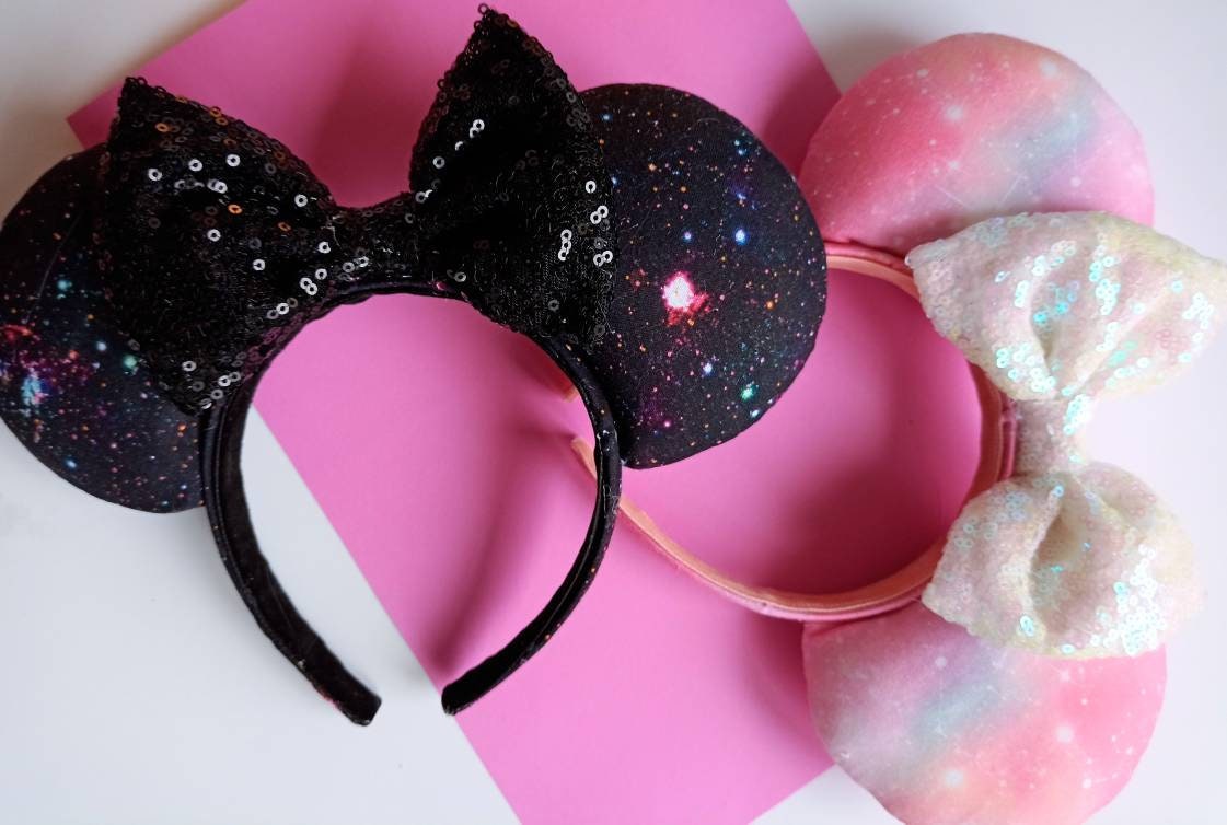 The perfect pair for all 4 parks! Gorgeous handmade mouse ears made with galaxy print fabric and a sequin bow (plenty different colours available just message me to change the bow). Handmade in Scotland with love, care and a little pixie dust. The ears are padded on both sides with a foam board interior to make them nice and sturdy. The headband is covered with matching fabric and is very comfortable. Headbands are a standard size and should fit adults and children, but most likely not suitable for toddlers.