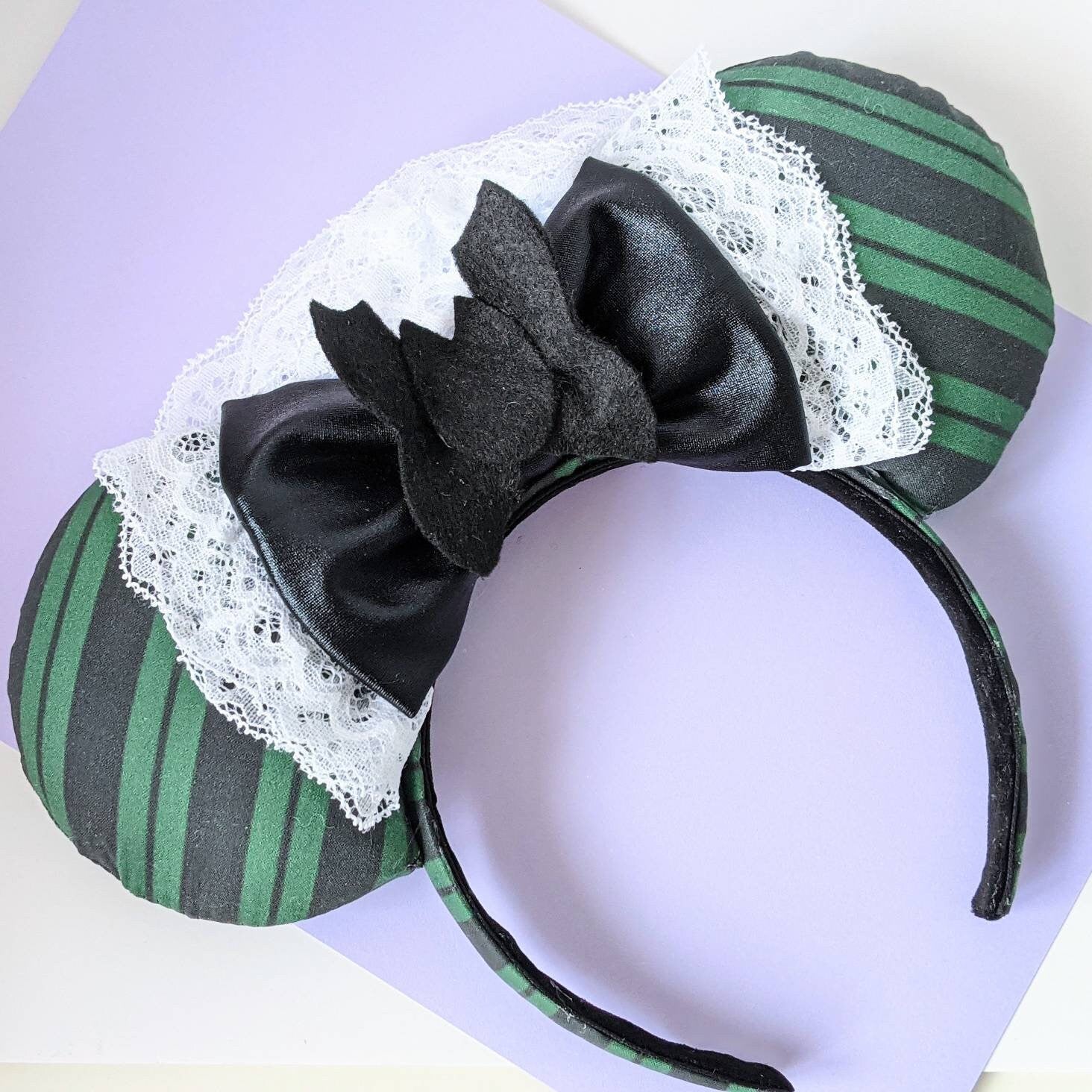 Gorgeous handmade Minnie Mouse ears made with green and navy striped fabric and lace, just like the cast member uniform! Handmade in Scotland with love, care and a little pixie dust. The ears are plush and padded on both sides with a foam board interior to make them nice and sturdy. The headband is covered with matching fabric and is very comfortable. Headbands are a standard size and should fit adults and children, but most likely not suitable for toddlers. All ears are custom made to order.