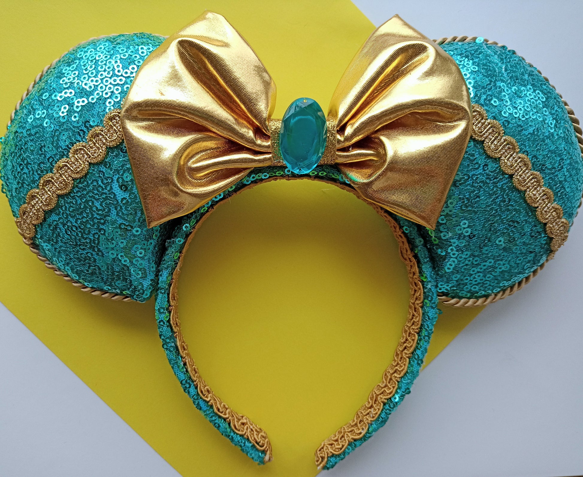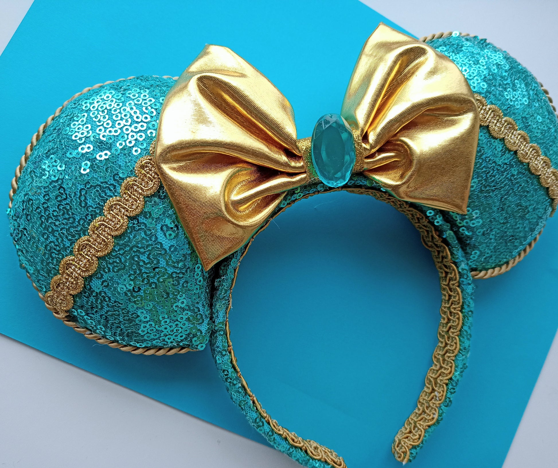 Gorgeous Jasmine inspired mouse ears handmade in Scotland with love, care and a little pixie dust. These ears are made with aqua coloured sequin on both sides and have a gold bow and jewel bow centre. They are padded on both sides with a sturdy foam board interior. Perfect for wearing all day and meeting this princess in the parks!
