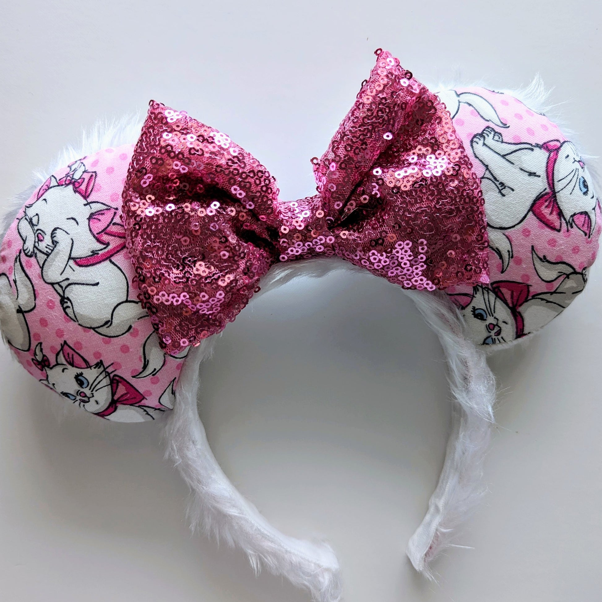 So darn cute! Marie is the inspiration for these ears. Made with Marie fabric on the front and white faux fur for the back and headband. These ears are finished with a gorgeous shiny pink bow. Handmade in Scotland with love, care and a little pixie dust.