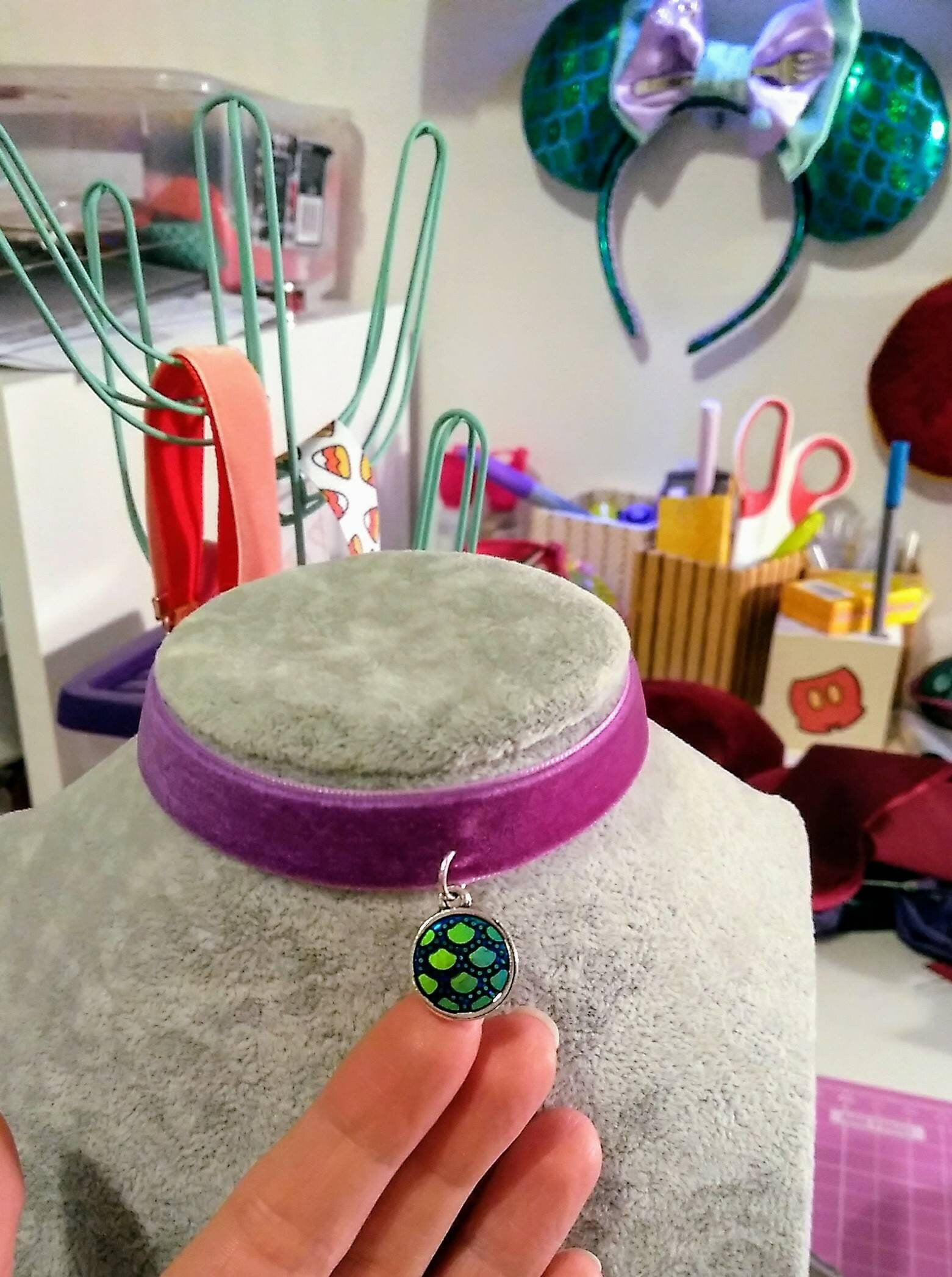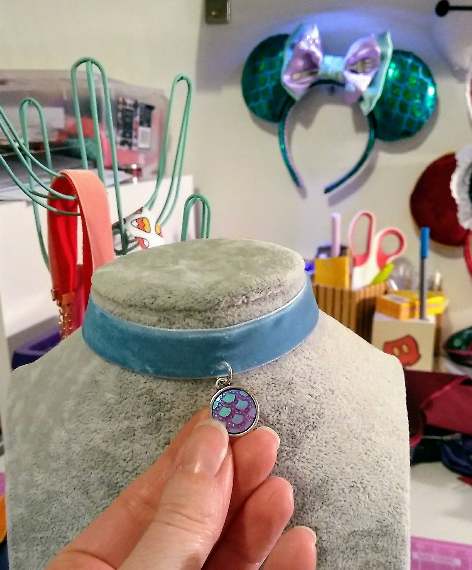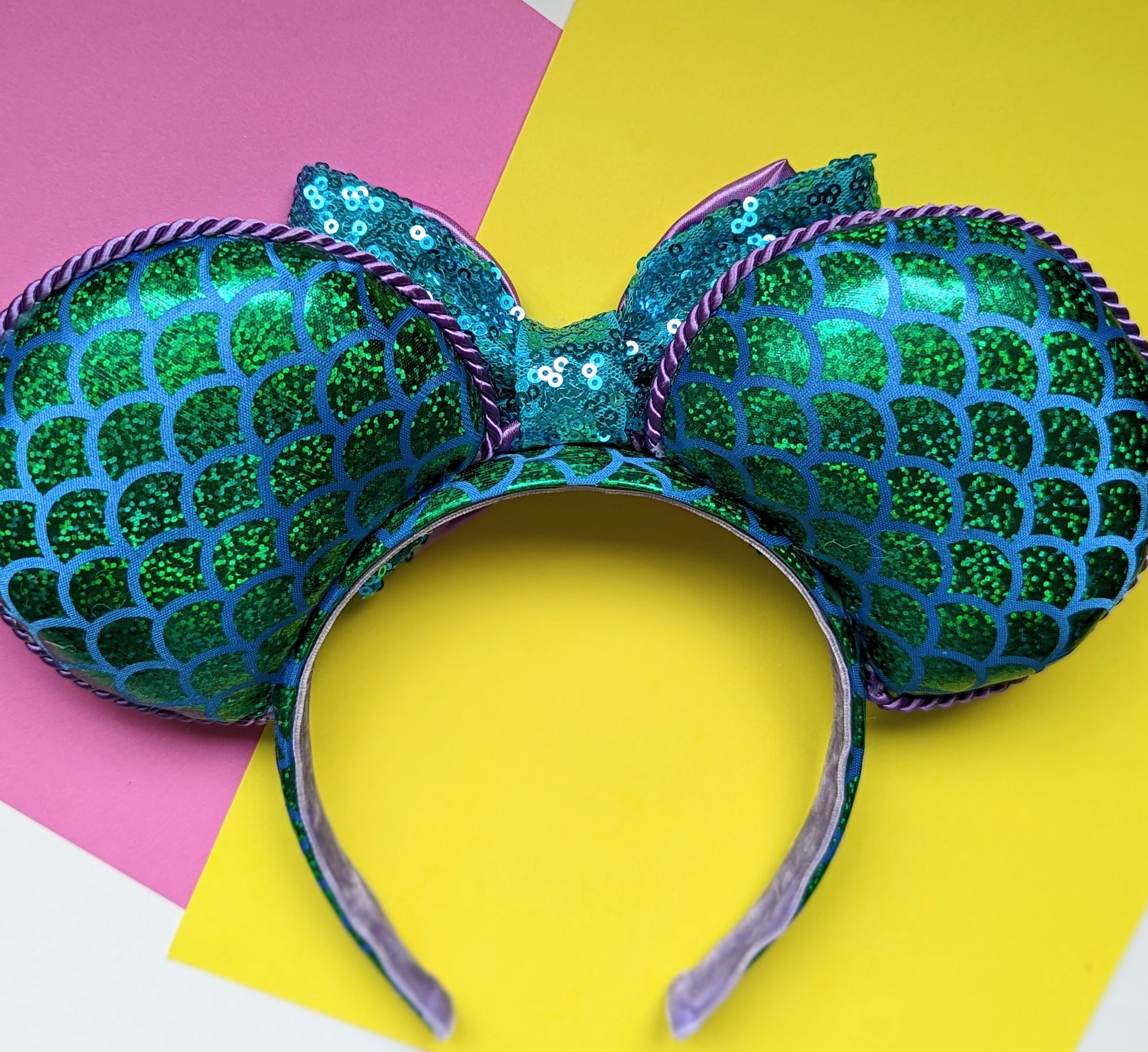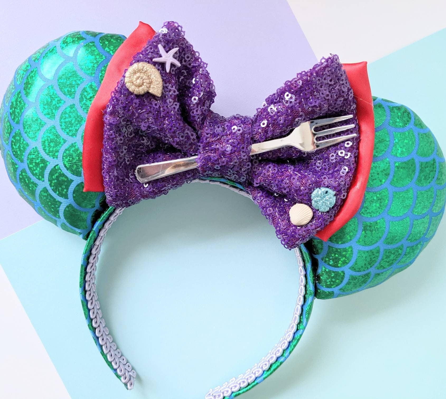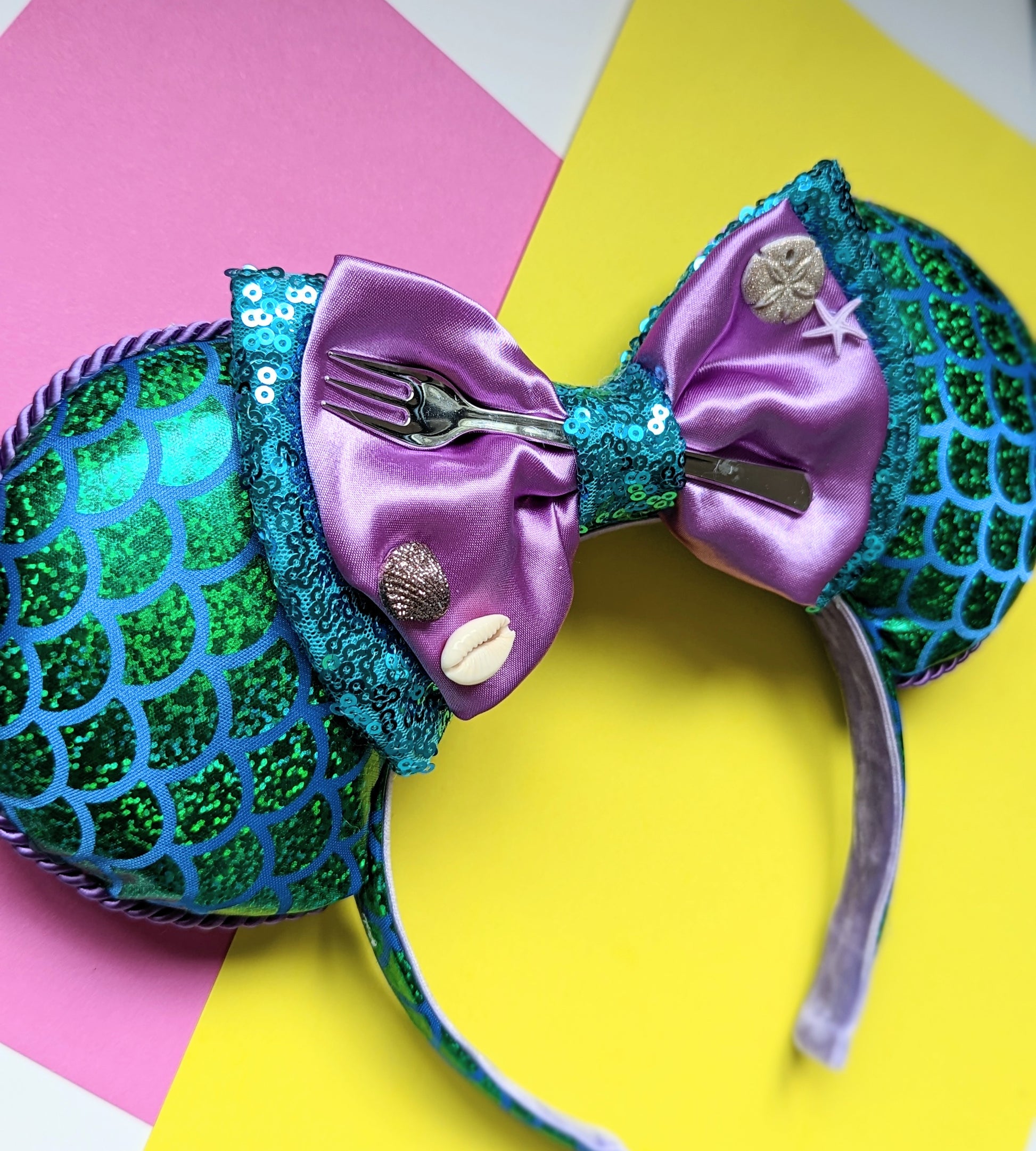 Gorgeous Little Mermaid inspired mouse ears handmade in Scotland with love, care and a little pixie dust. These ears are made with blue/green hologram mermaid scale fabric on both sides and have a sparkly sequin purple and red or lilac and aqua Ariel style double bow with seashell and dinglehopper adornments.