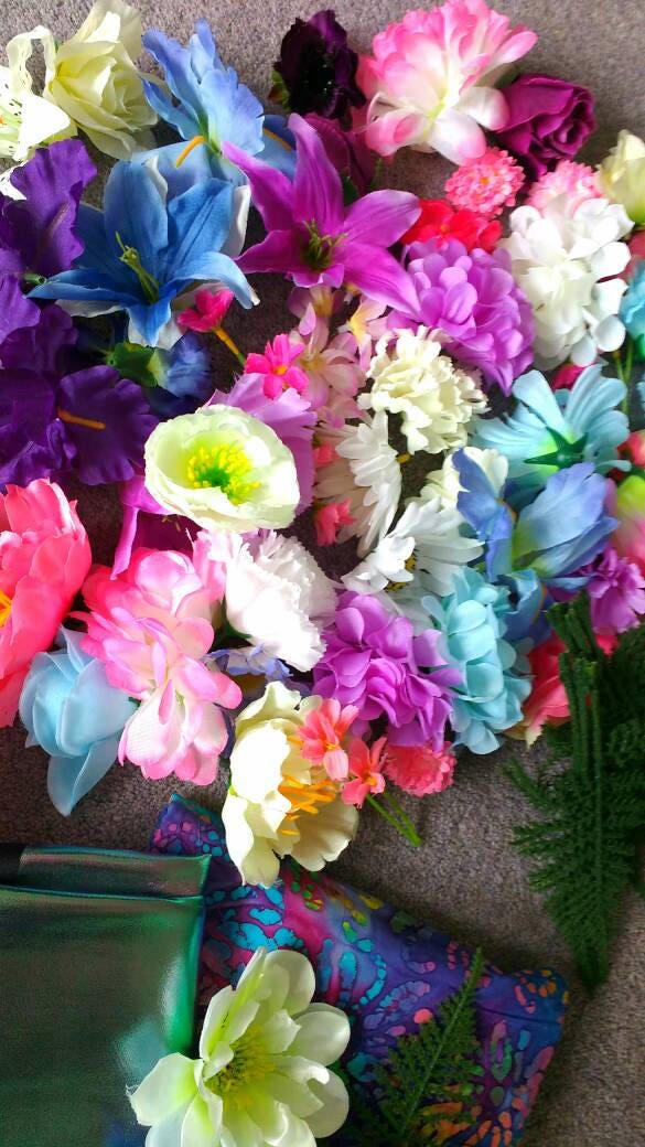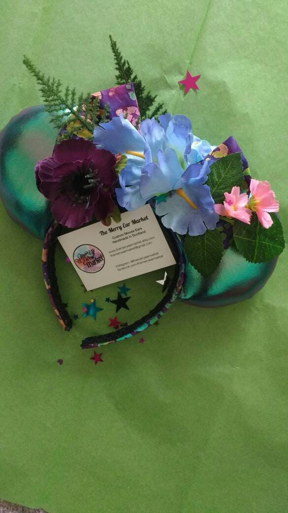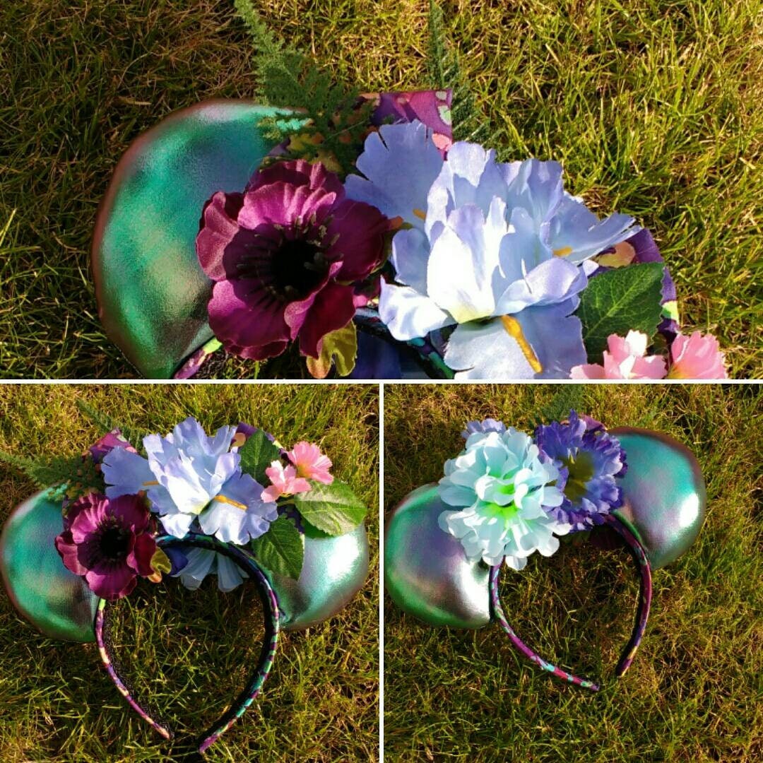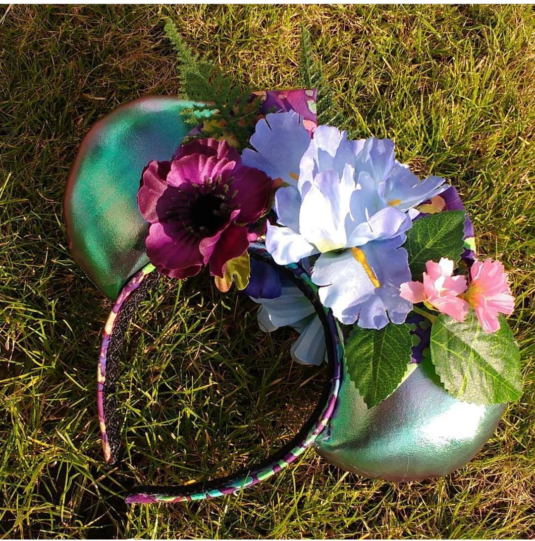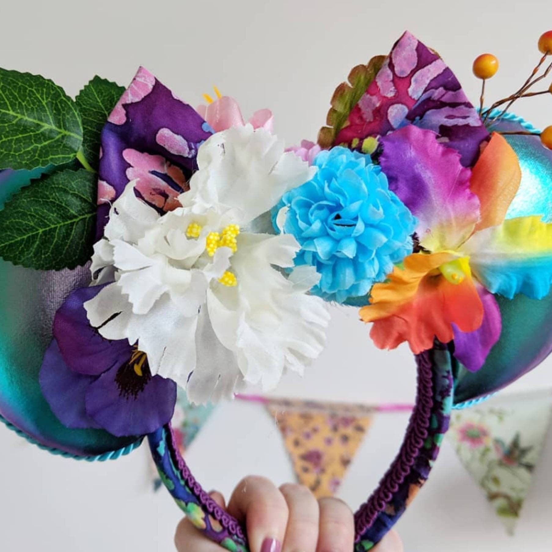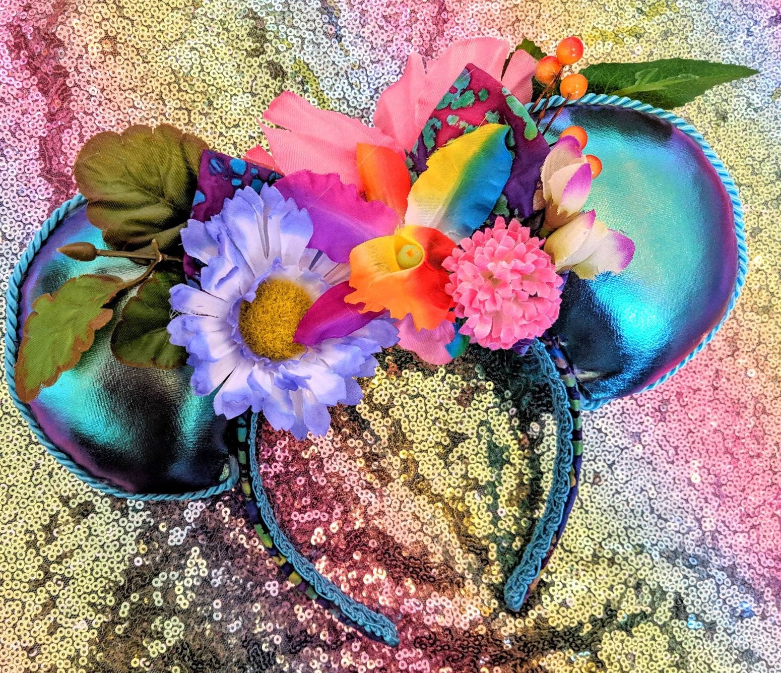 Super gorgeous Avatar, Pandora inspired mouse ears made with shiny colour shifting fabric and a colourful bow peeking out from behind the beautiful artificial flowers which are on both sides! Perfect for Animal Kingdom (but would look equally good at Flower and Garden Festival!).