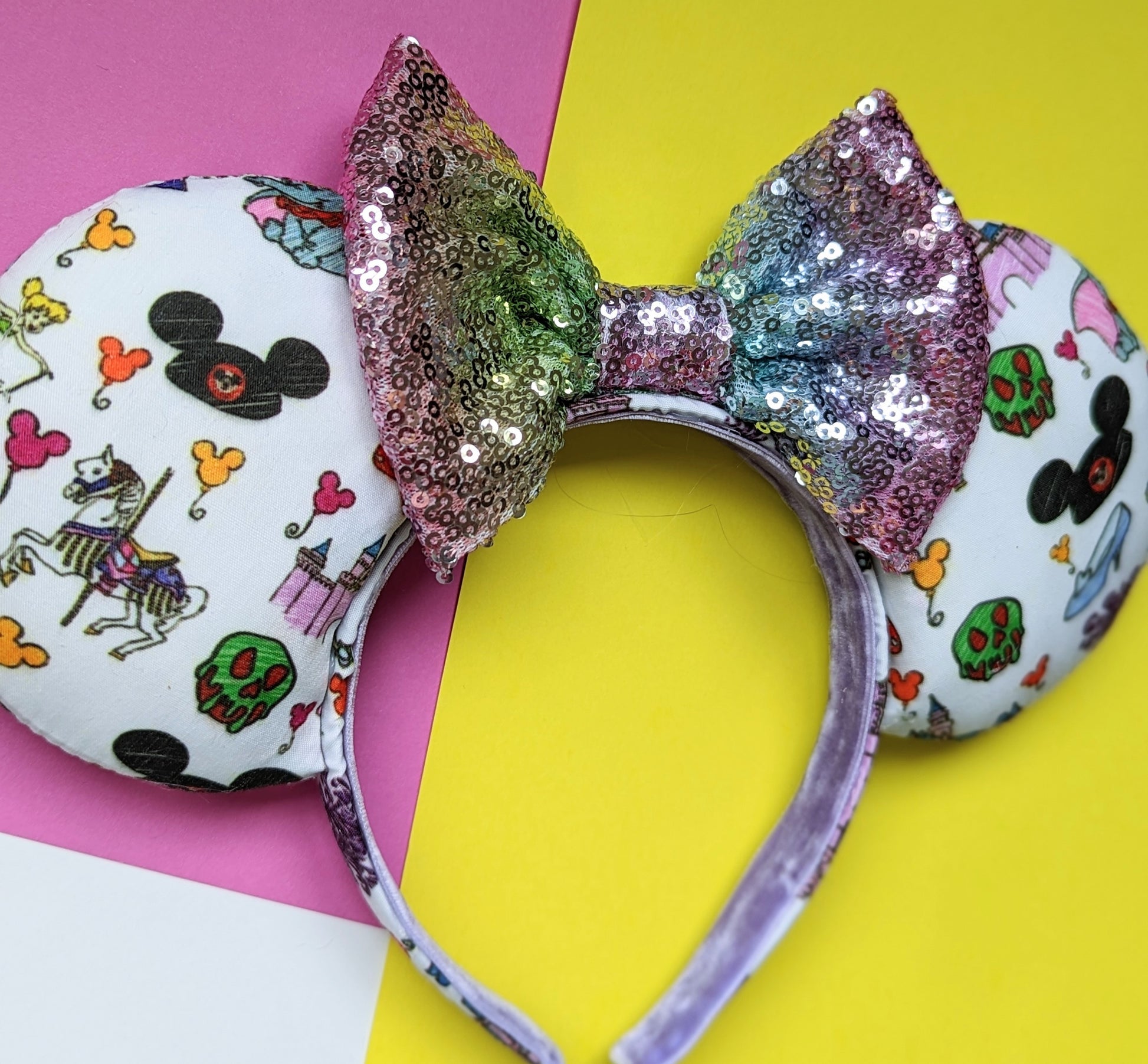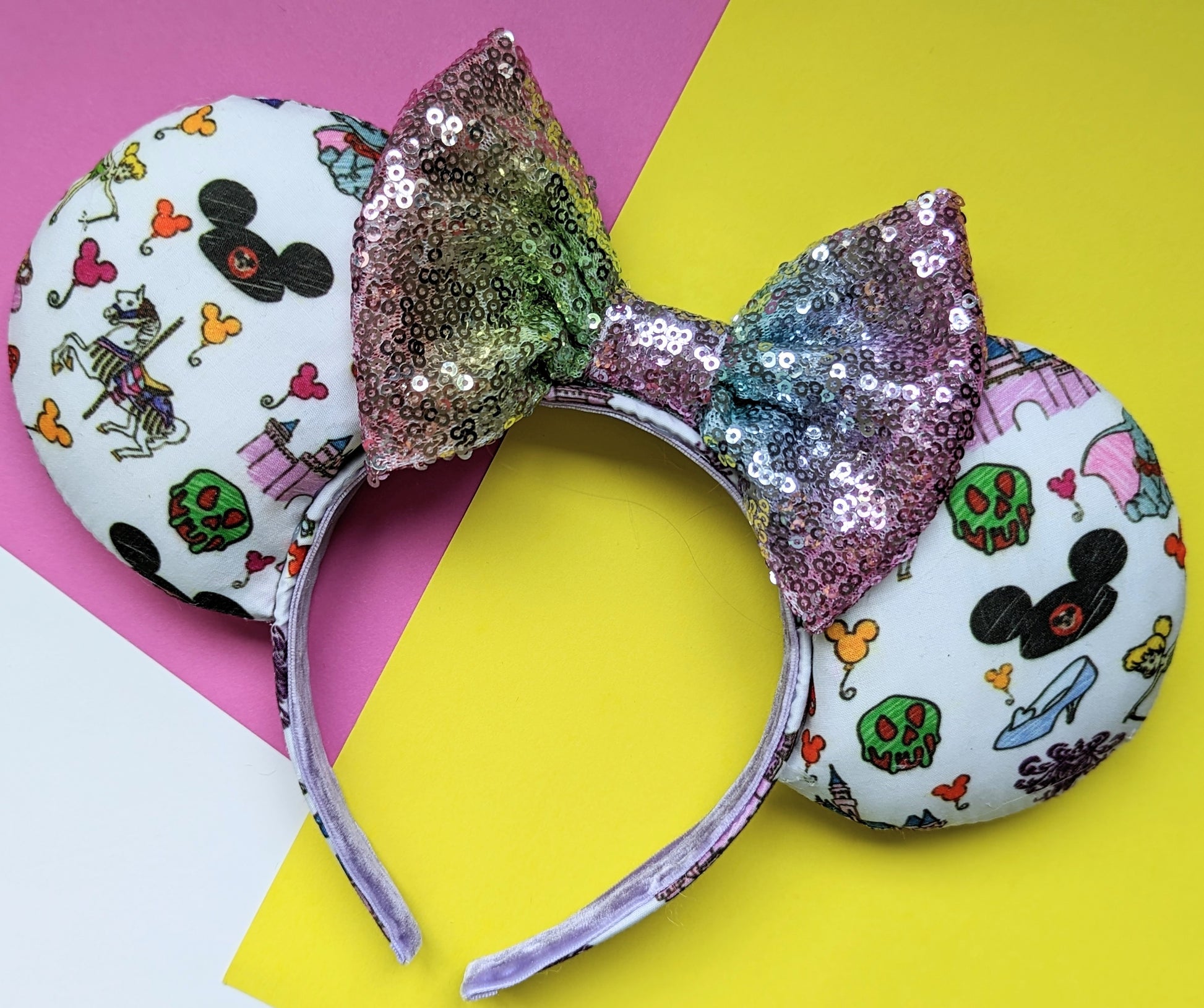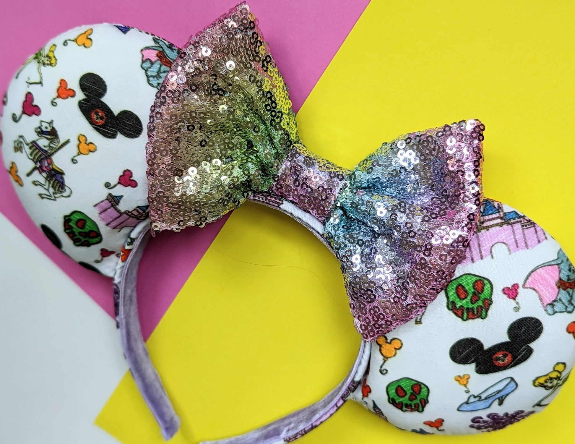 Gorgeous handmade mouse ears inspired by your favourite Park icons! The photos feature a rainbow sequin bow, but I have a variety of bows available - please leave a note when you checkout if there's a particular colour you would like.