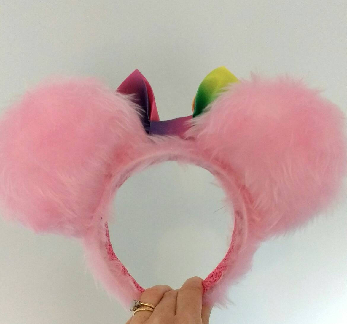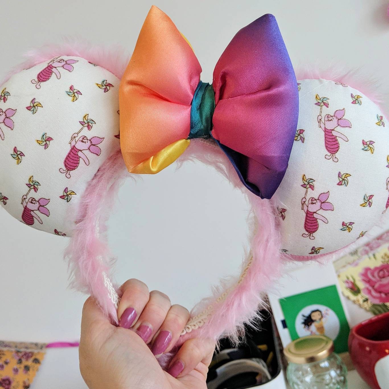 Gorgeous Piglet inspired mouse ears handmade in Scotland with love, care and a little pixie dust. These ears are made with Piglet character fabric on one side and pink faux fur on the other. They have a rainbow satin bow and are padded on both sides with a sturdy foam board interior.