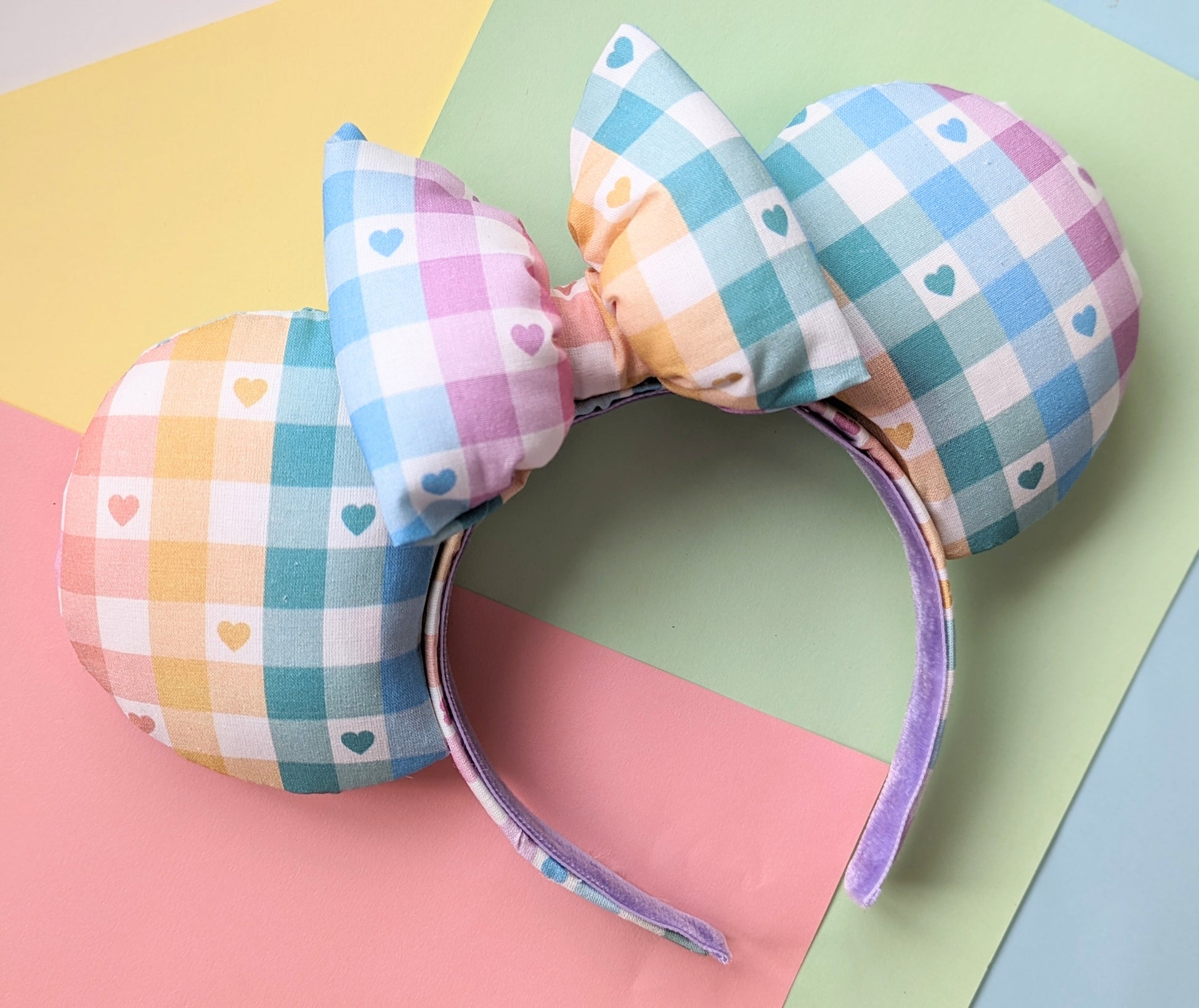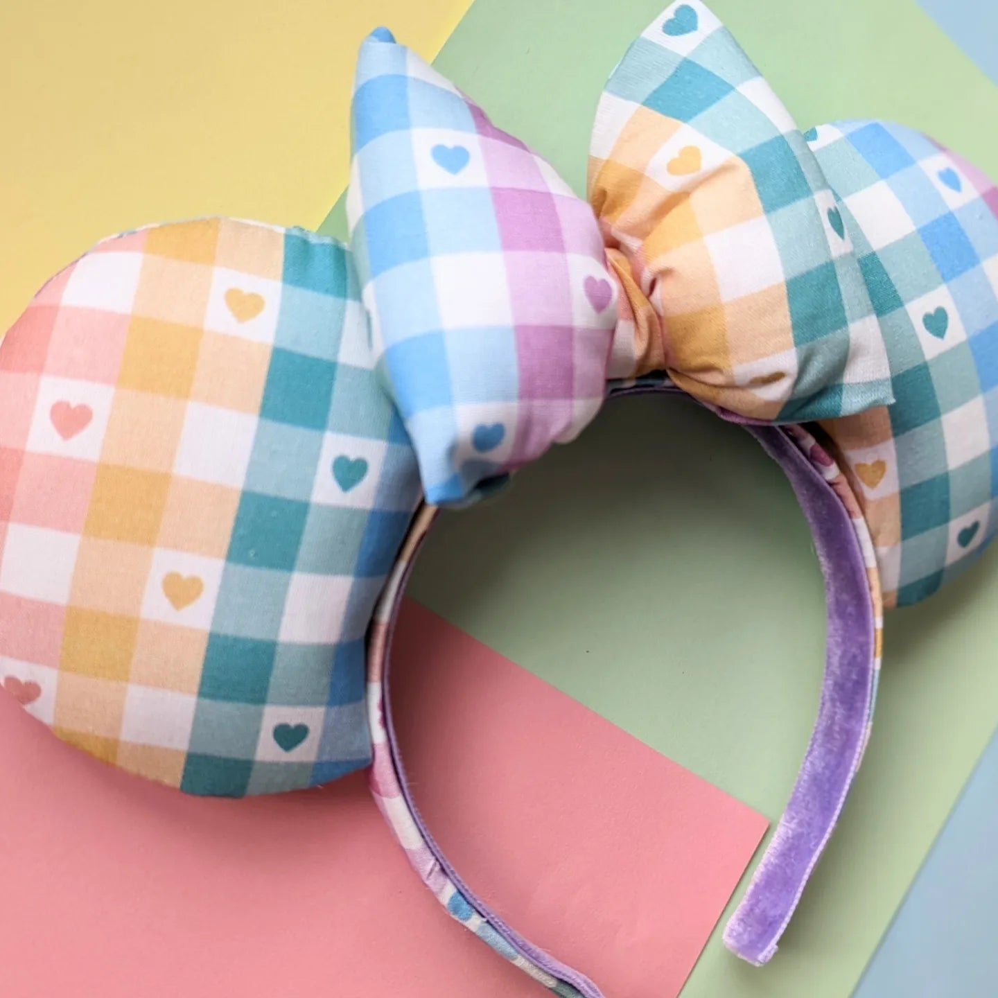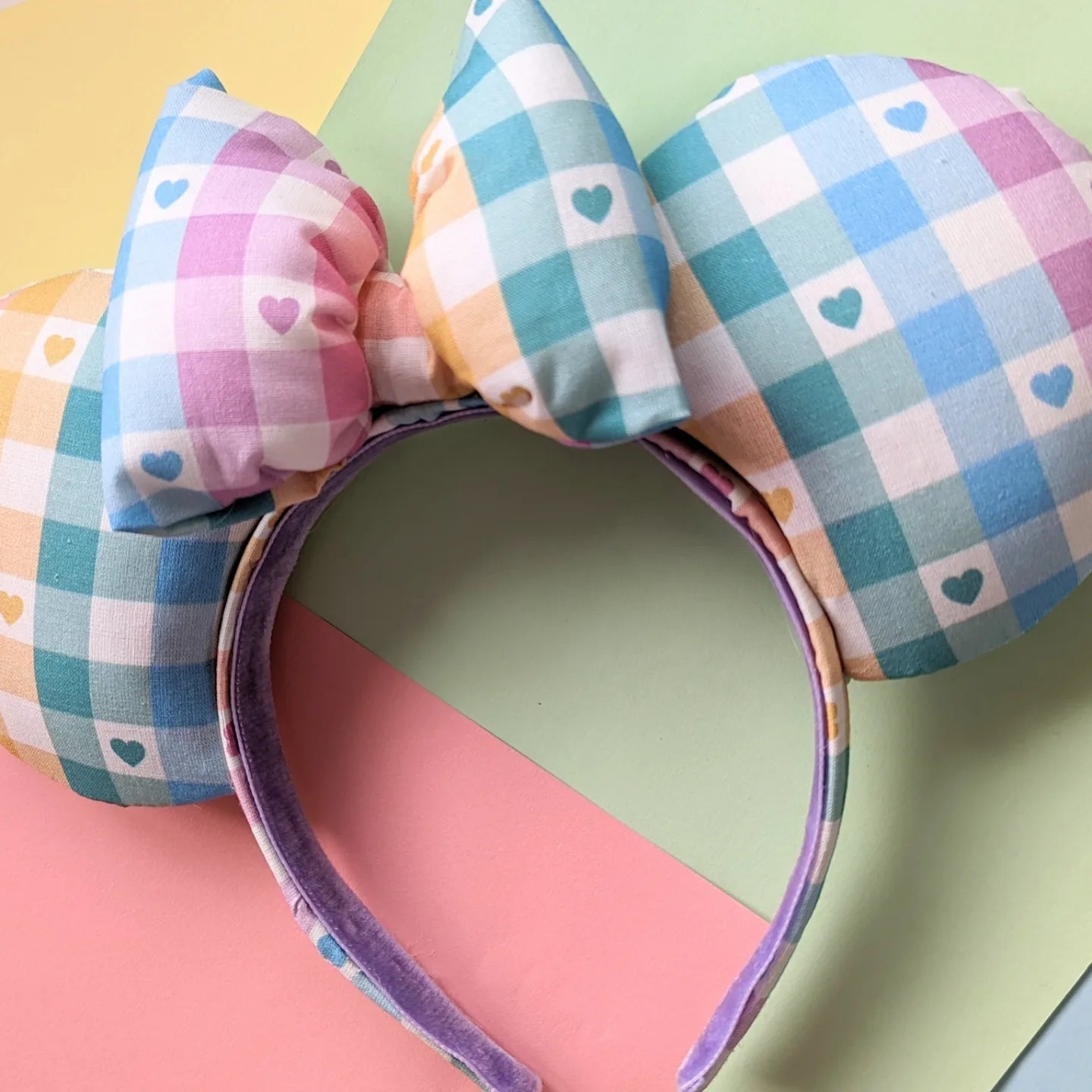 Perfect for spring/summer! Pastel rainbow gingham with cute little hearts and a puffy bow! Made by me in Scotland with love, care and a little pixie dust. They are padded on both sides with a sturdy foam board interior. The headband is standard size but flexible and should fit adults and children (but most likely not suitable for toddlers) I love making custom orders! Please feel free to contact me if you'd like something a little different.