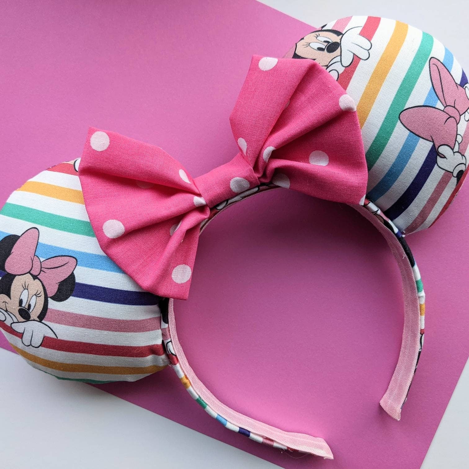 Gorgeous handmade Minnie Mouse ears made with Minnie rainbow fabric and a classic polkadot bow.
