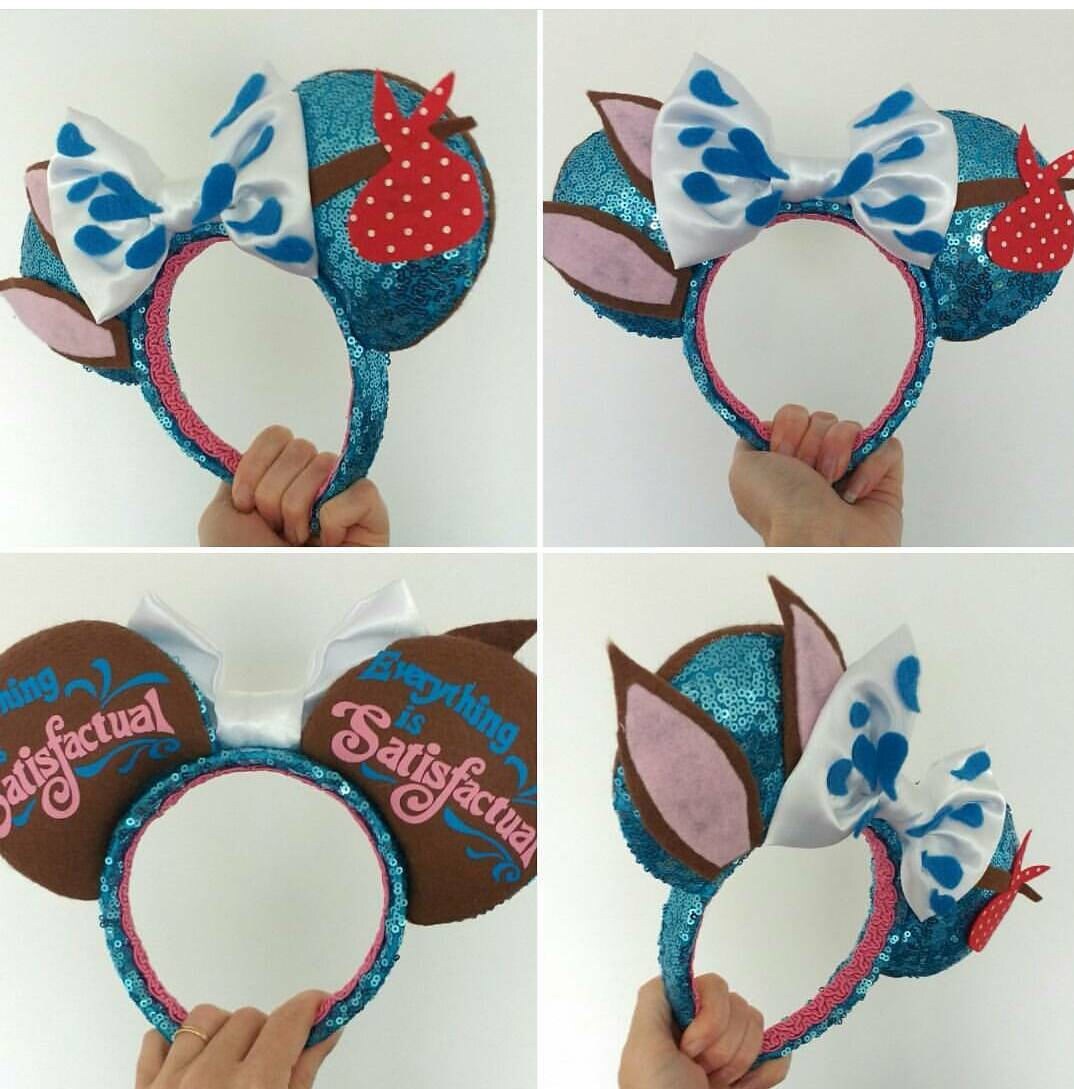 Sorcerer Mickey inspired mouse ears made with blue sequin fabric to the front and brown felt featuring 'Everything is Satisfactual' on the back. Complete with Brer Rabbit ears and napsack.