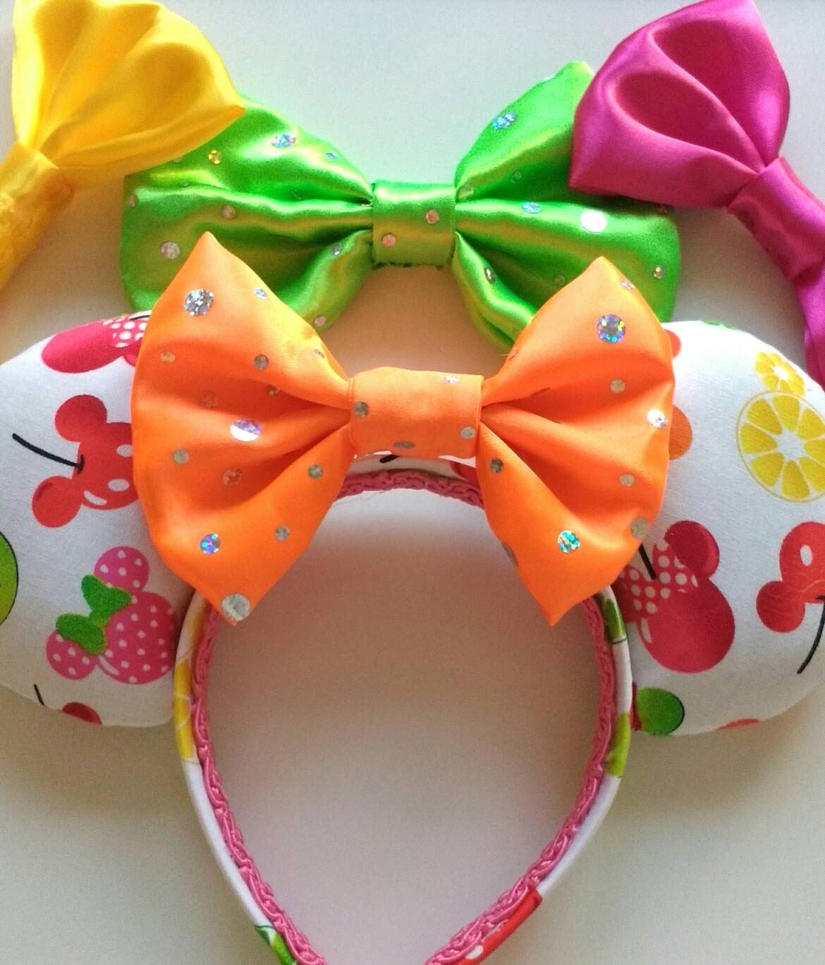 Gorgeous handmade Minnie Mouse ears made with cute, bright and colourful fruity fabric