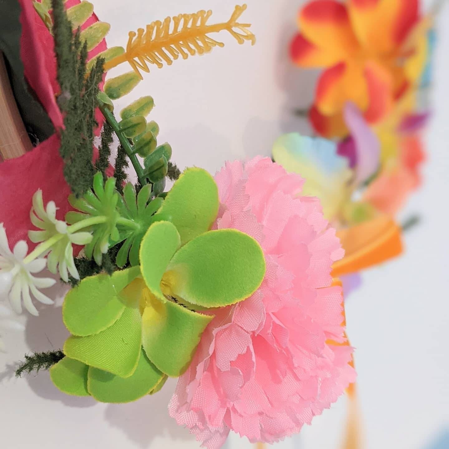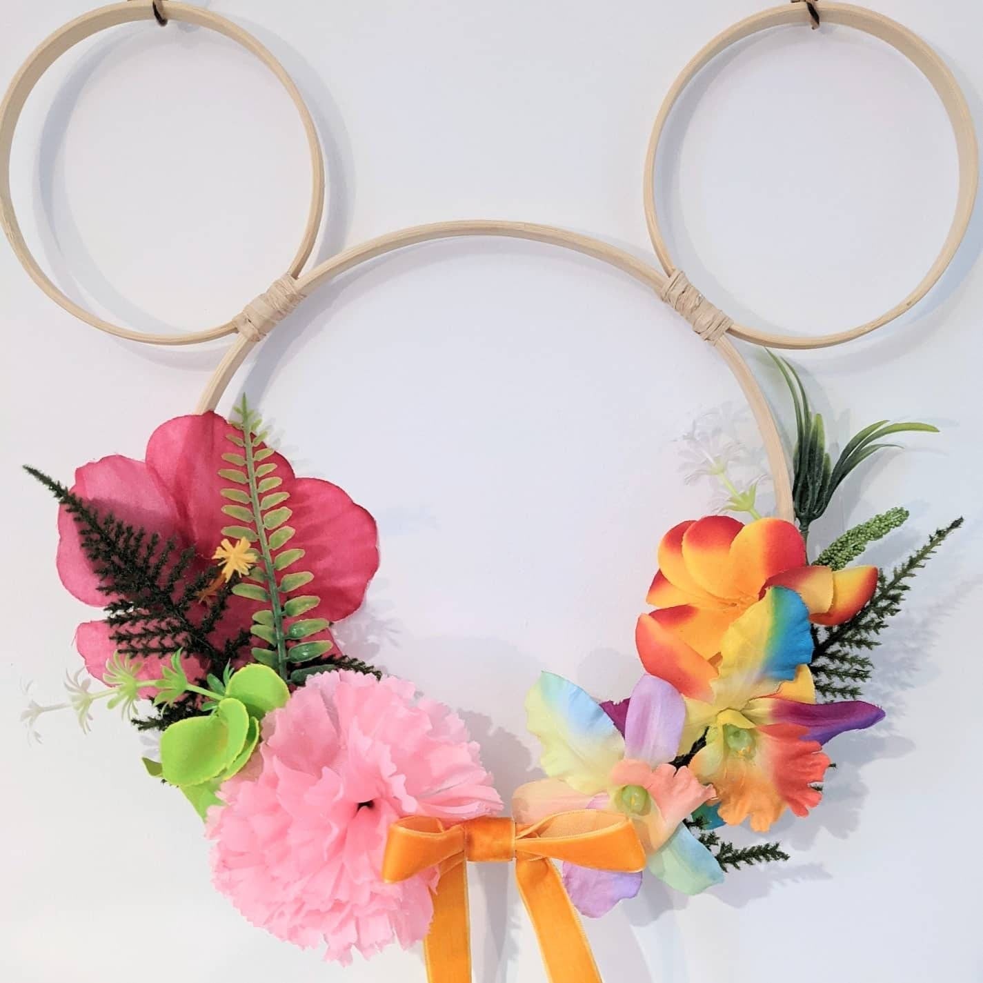 Mickey/Minnie shaped hoop wreath wall hanging made with beautiful artificial flowers (picture is for illustrative purposes and flower placement will be similar but not exactly the same). Various sizes available. Message me to discuss custom options.