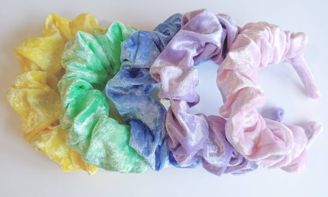 Pastel velvet scruchie style hairband. A soft and flexible hairband in a choice cute fabrics. Suitable for kids and adults.